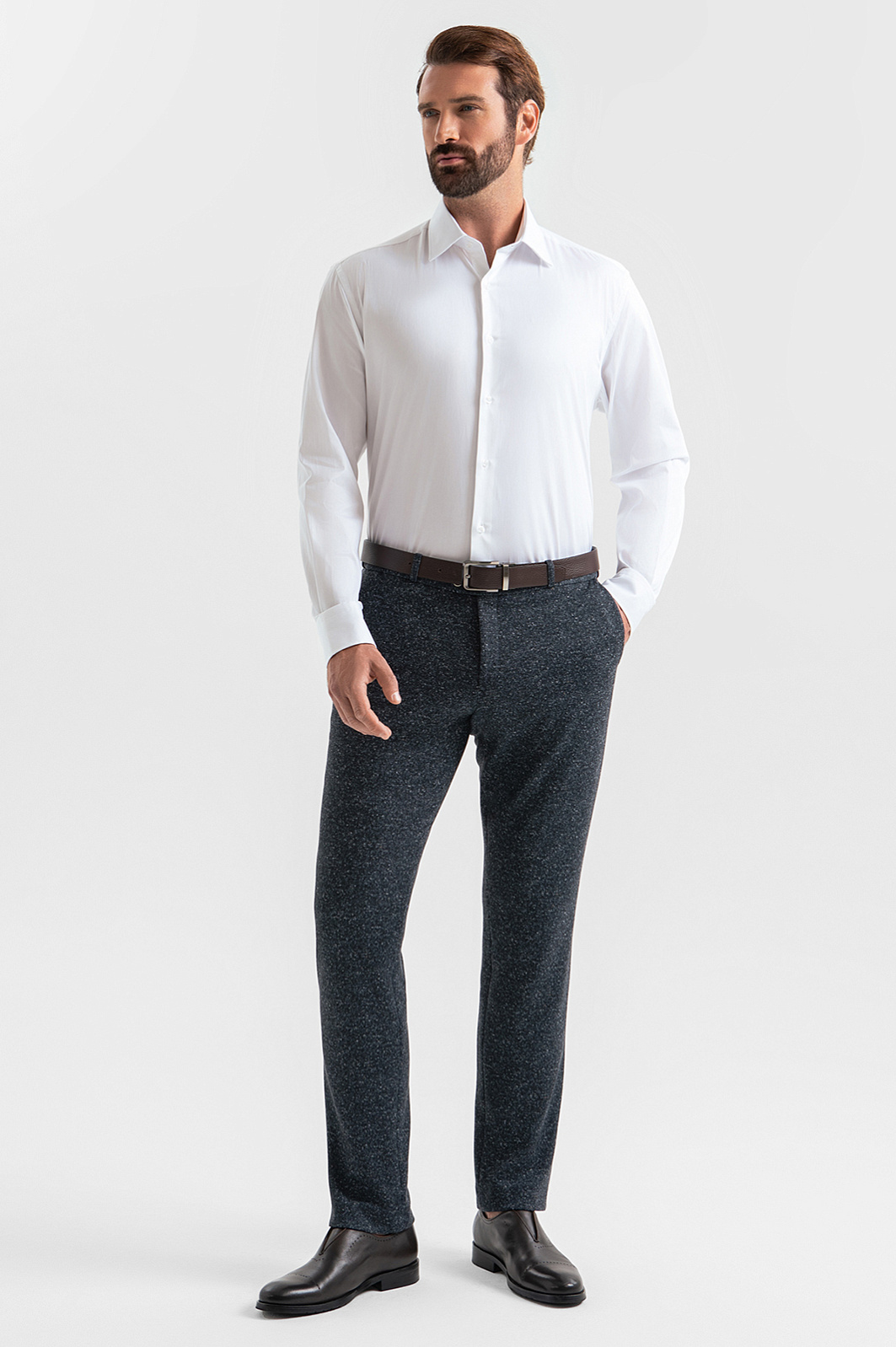 Брюки KANZLER из темно-серого смесового хлопкового трикотажа с белыми вкраплениями — модель для неофициальных выходов и создания стильных повседневных образов. Ткань мягко облегает тело, Приталенный силуэт визуально вытягивает фигуру, задавая вертикаль. Переплетение темно-серых и белых волокон придает ткани фактурность. Гипоаллергенные хлопковые волокна обеспечивают комфорт в носке. Полиэстер служит для прочности, а небольшое включение эластана сохраняет аккуратный вид. Гладкая износоустойчивая подкладка облегчает надевание. Параметры модели: рост 189, 102-80-99 Размер на модели: 50