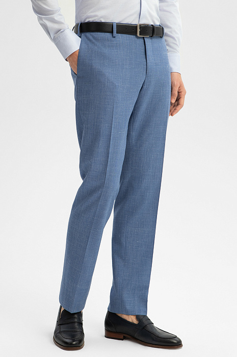 Классические брюки KANZLER василькового оттенка из шерсти, льна и шелка — элегантный вариант для офиса и неофициальных поводов. Строгий, слегка зауженный силуэт в сочетании со стрелками задает вертикальное направление и вытягивает фигуру. Ткань с красивым полотняным переплетением сделана из тонкой овечьей шерсти Супер 120S (82%), льна и шелка. Шерсть хорошо держит форму, благодаря чему брюки легко перенесут поездку в машине и рабочий день в офисе. Лен обеспечивает циркуляцию воздуха. Шелк придает материалу благородный лоск. Параметры модели: рост 191, 97-77-99 Размер на модели: 50