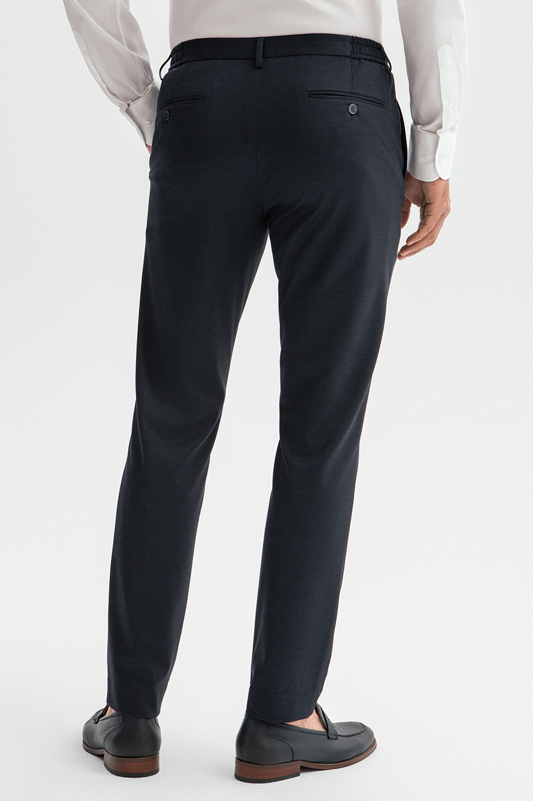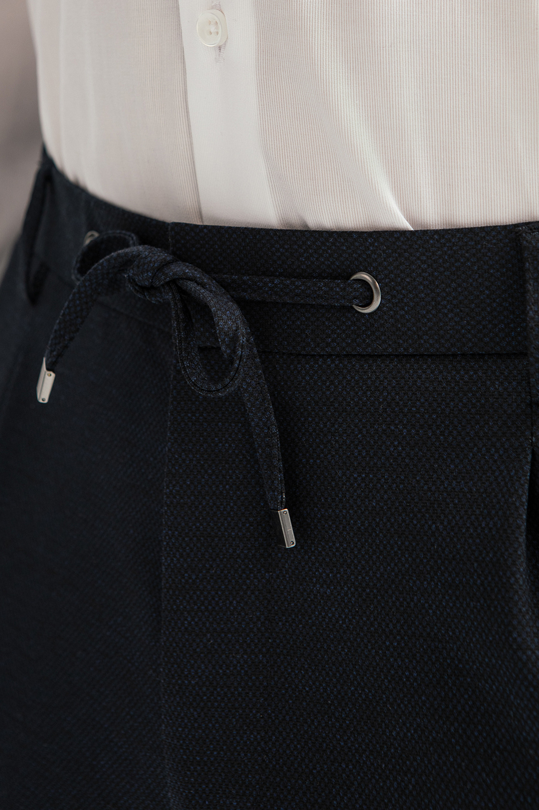 Брюки KANZLER глубокого темно-синего цвета слегка зауженного силуэта на кулиске — не слишком формальная, но при этом комфортная и элегантная одежда для офиса и свободного времени. Секрет популярности — в отсутствии стесняющего пояса. Вместо жестких ограничений — удобная кулиска, позволяющая регулировать степень прилегания, и вшитые по бокам резинки. Технологичная смесовая ткань с переплетением «елочка» состоит из трех видов современных волокон. Она хорошо держит форму, не мнется и легко адаптируется к индивидуальным особенностям фигуры. Параметры модели: рост 189, 102-80-99 Размер на модели: 50
