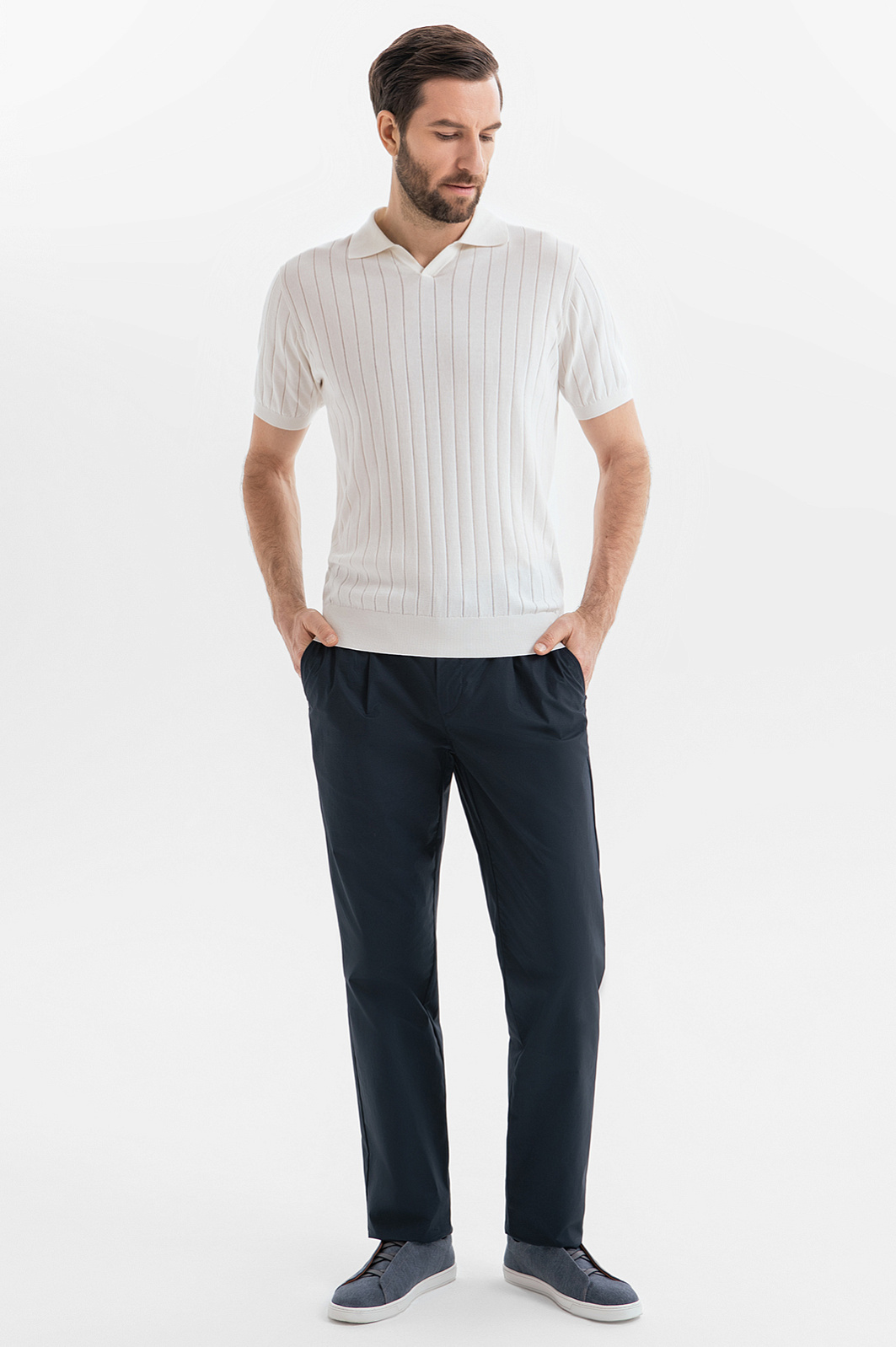 Брюки KANZLER темно-синего цвета созданы из легкой и дышащей хлопковой ткани (95,5% хлопка и 4,5% спандекса). Материал с гладкой фактурой обладает отличной воздухопроницаемостью, мягкостью и эластичностью. Классический крой подчеркивает силуэт, не сковывая движений, а защипы на талии добавляют образу нотку динамичности и расслабленности. Удобная посадка с поясом на кулиске и минималистичный крой создают гармоничный баланс между расслабленностью и элегантностью. Брюки идеально подойдут для образов в стиле кежуал на любой случай — будь то прогулка по городу, неформальная встреча или день в офисе с нестрогим дресс-кодом. Параметры модели: рост 187, 99-81-97 Размер на модели: 50