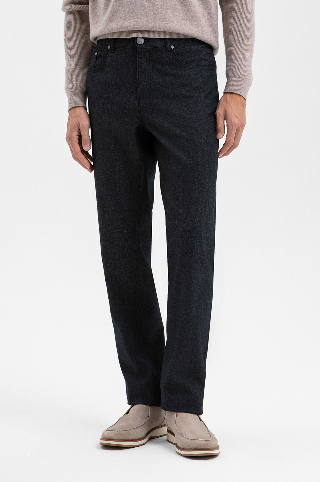 Чёрные брюки KANZLER из лимитированной коллекции с традиционным джинсовым кроем преобразует повседневную эстетику в более элегантный и непринуждённый вариант городской одежды, который легко вписывается в деловой гардероб и современные неформальные образы. Силуэт подходит для любого типа фигуры, обеспечивая комфорт, свободу движений и ощущение уверенности. Саржевое плетение придаёт цвету глубину и насыщенность, а ткани — прочность и долговечность. Натуральный воздухопроницаемый материал — бленд хлопка и шерсти — поддерживает свежесть и сохраняет естественное тепло тела. Параметры модели: рост 188, 97-82-92 Размер на модели: 50