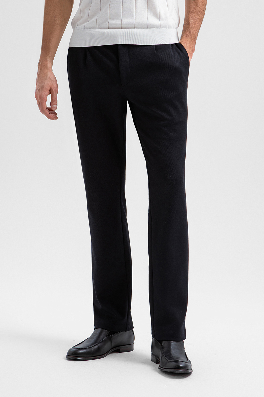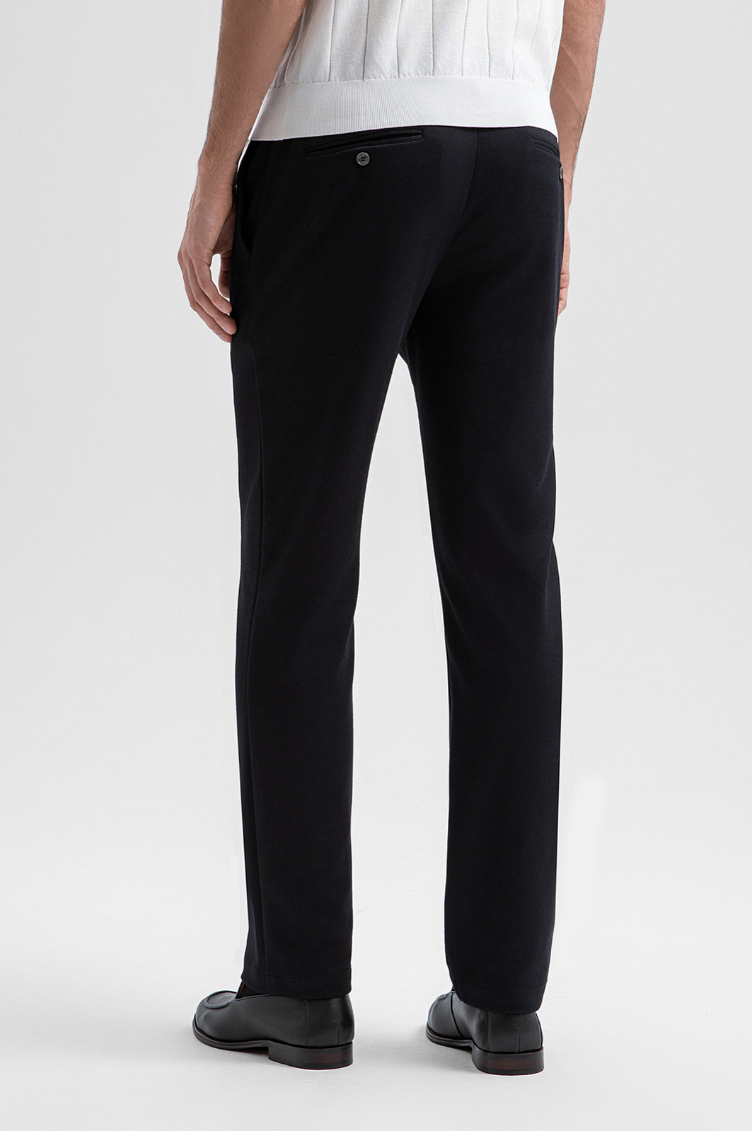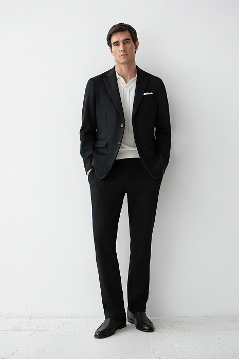 Чёрные слегка зауженные брюки KANZLER на кулиске — комфортная альтернатива классике. В сочетании с пиджаком брюки создают стильный и элегантный деловой образ, а в качестве самостоятельного элемента они гармонично сочетаются с рубашками и тонким трикотажем. Лаконичный силуэт сохраняет свободу движений. Кулиска позволяет регулировать степень прилегания и делает посадку максимально естественной. Практичная ткань на основе полиэстера с добавлением хлопка, района и спандекса практична и устойчива к износу, хорошо пропускает воздух и обеспечивает комфорт при активном ритме жизни.