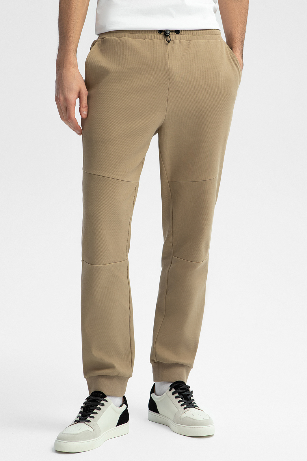 Джоггеры KANZLER из бежевой хлопковой ткани в диагональный рубчик с контрастными деталями предназначены для мужчины, который хочет оставаться стильным и в свободное время. В них удобно гулять в парке, совершать пробежки и предаваться расслабленному отдыху. Свободный крой не сковывает движений. Контрастные детали придают брюкам современный динамичный вид. Резинка с фиксатором позволяет регулировать объем талии. Модель сшита из гипоаллергенного хлопка (89%) с добавлением полиэстера. Дышащий натуральный материал сохраняет естественное тепло тела, не боится капризов погоды и выдержит испытание временем. Параметры модели: рост 192, 101-76-97 Размер на модели: M