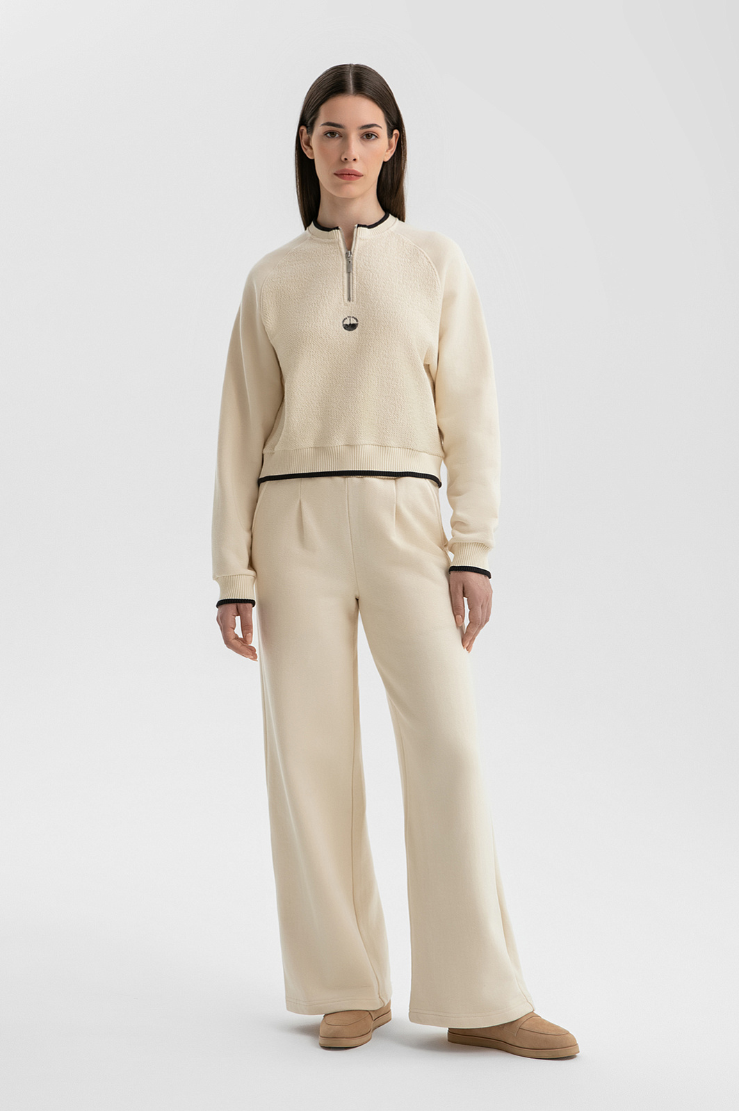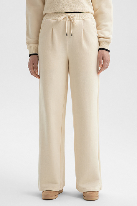 Удобные стильные брюки KANZLER кремового цвета из чистого хлопка с расслабленном силуэтом обеспечивает комфорт и свободу движений. Это нарядный и эффектный вариант для уикенда, прогулки, похода в спортивный клуб или спа. Пояс с широкой трикотажной резинкой дополнен кулиской с шнурком, которая позволяет регулировать посадку. Плавный клёш от бедра и мягкие защипы спереди формируют женственный силуэт, визуально удлиняя ноги и придавая образу непринуждённость. Материал брюк — мягкий приятный к телу натуральный трикотаж из дышащего гипоаллергенного хлопка (100%), который поддерживает комфорт тела весь день.