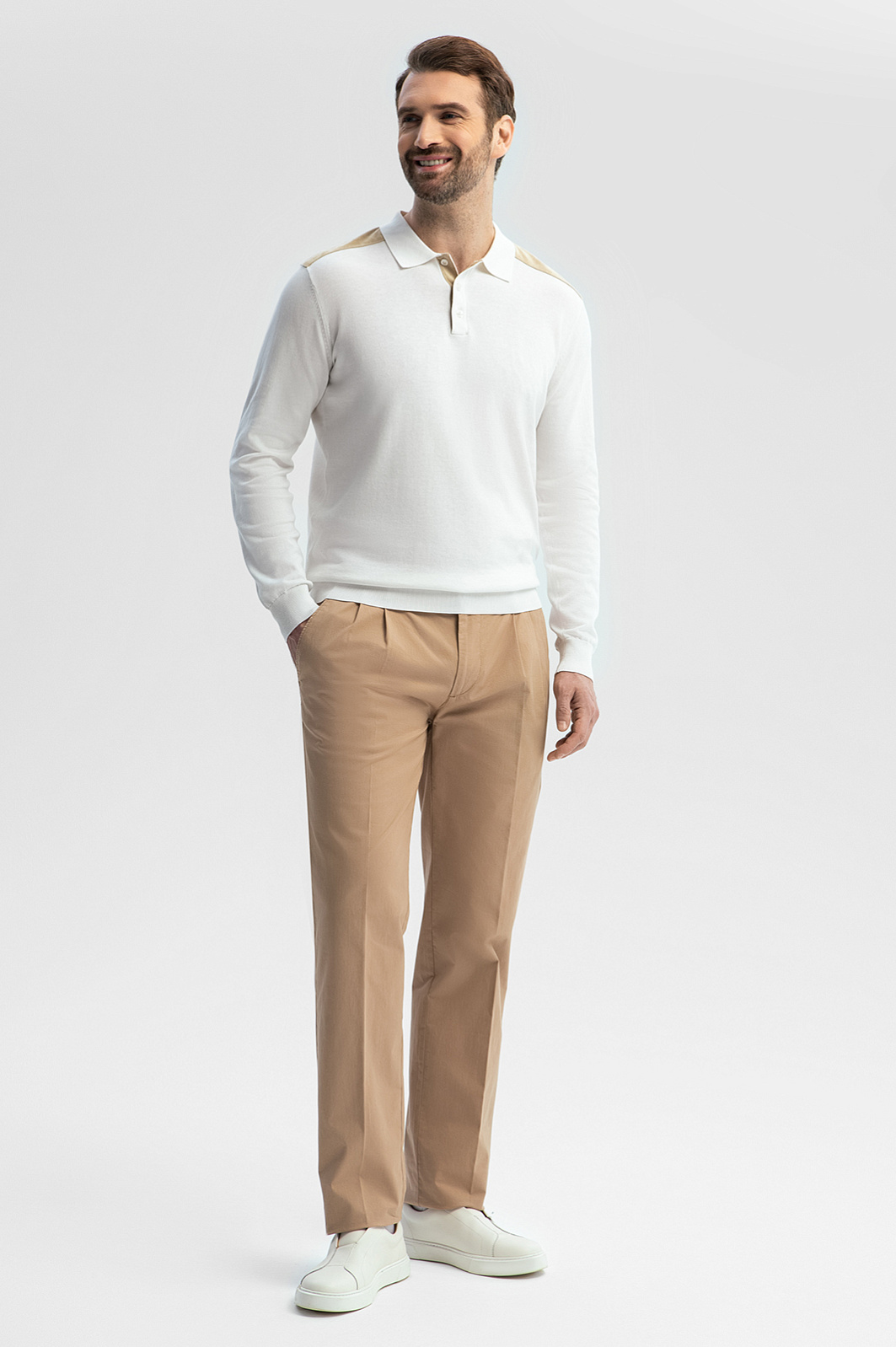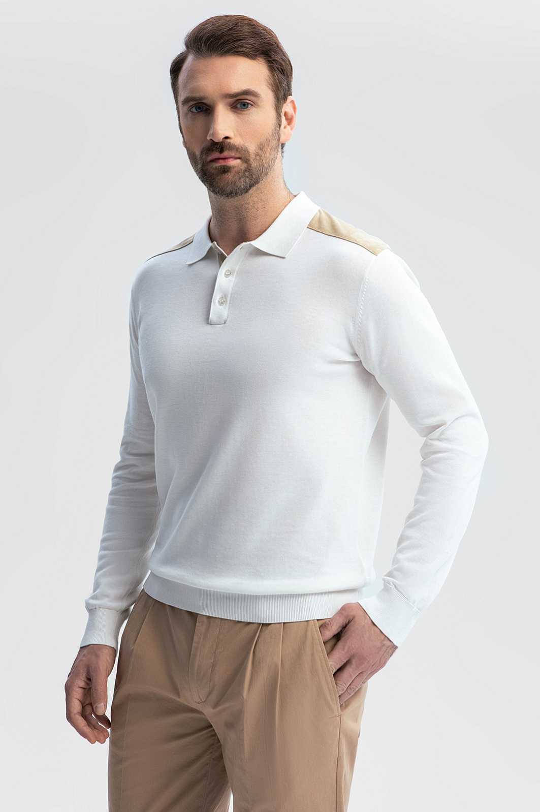 Роскошное белое поло KANZLER с отделкой из премиальной алькантары — для тех, кто привык выбирать лучшее. Модель выполнена из уникального сочетания натуральных волокон: 85% хлопок обеспечивает мягкость и воздухопроницаемость, 10% шёлк дарит ощущение нежности, а 5% лён служит прочности и сохранению формы. Гладкая фактура материала обеспечивает деликатное соприкосновение с кожей и дарит комфорт в течение всего дня. Отделка из бархатистой алькантары на плечах добавляет утончённый штрих. Элегантный и универсальный белый цвет освежает и гармонично встраивается в любой образ. Стилисты рекомендуют дополнить поло бежевыми брюками с защипами и белыми кедами из натуральной кожи. Параметры модели: рост 189, 102-80-99 Размер на модели: M