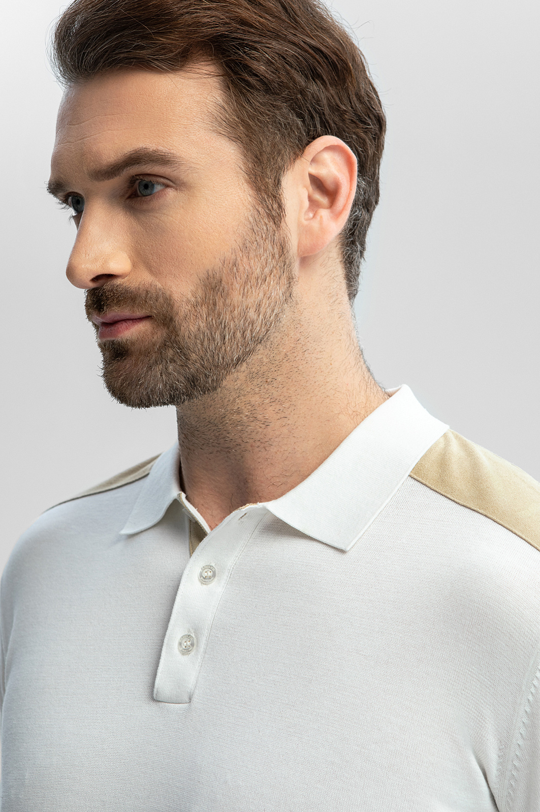 Белое поло из хлопка, шелка и льна с отделкой из алькантары в Саратове