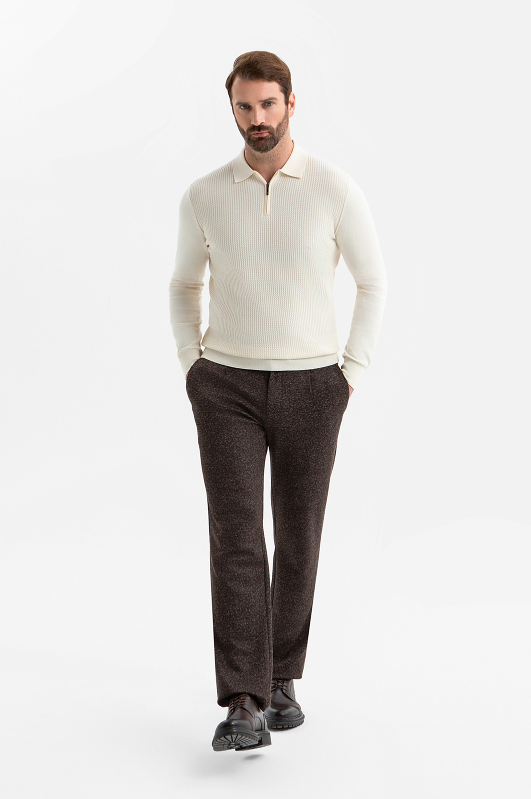 Джемпер поло KANZLER светло-бежевого оттенка с молнией — стильная универсальная модель, которая делает повседневные образы лёгкими и нарядными. Передняя часть джемпера выполнена из фактурного трикотажа, привлекающего внимание. Спинка и рукава из гладкого полотна создают аккуратный силуэт и подчеркивают чистоту линий. Манжеты и нижний край оформлены эластичной трикотажной резинкой, что обеспечивает аккуратный вид. Особое достоинство изделия — материал хлопок Пима. Это один из лучших сортов хлопка в мире, известный своей исключительной мягкостью, прочностью и долговечностью. Волокна пима длиннее и крепче обычных, благодаря чему ткань сохраняет форму, не скатывается. Воздухопроницаемый гипоаллергенный материал дышит, поддерживает приятную для тела температуру, сочетая практичность с премиальной изысканностью. Параметры модели: рост 189, 102-80-99 Размер на модели: M