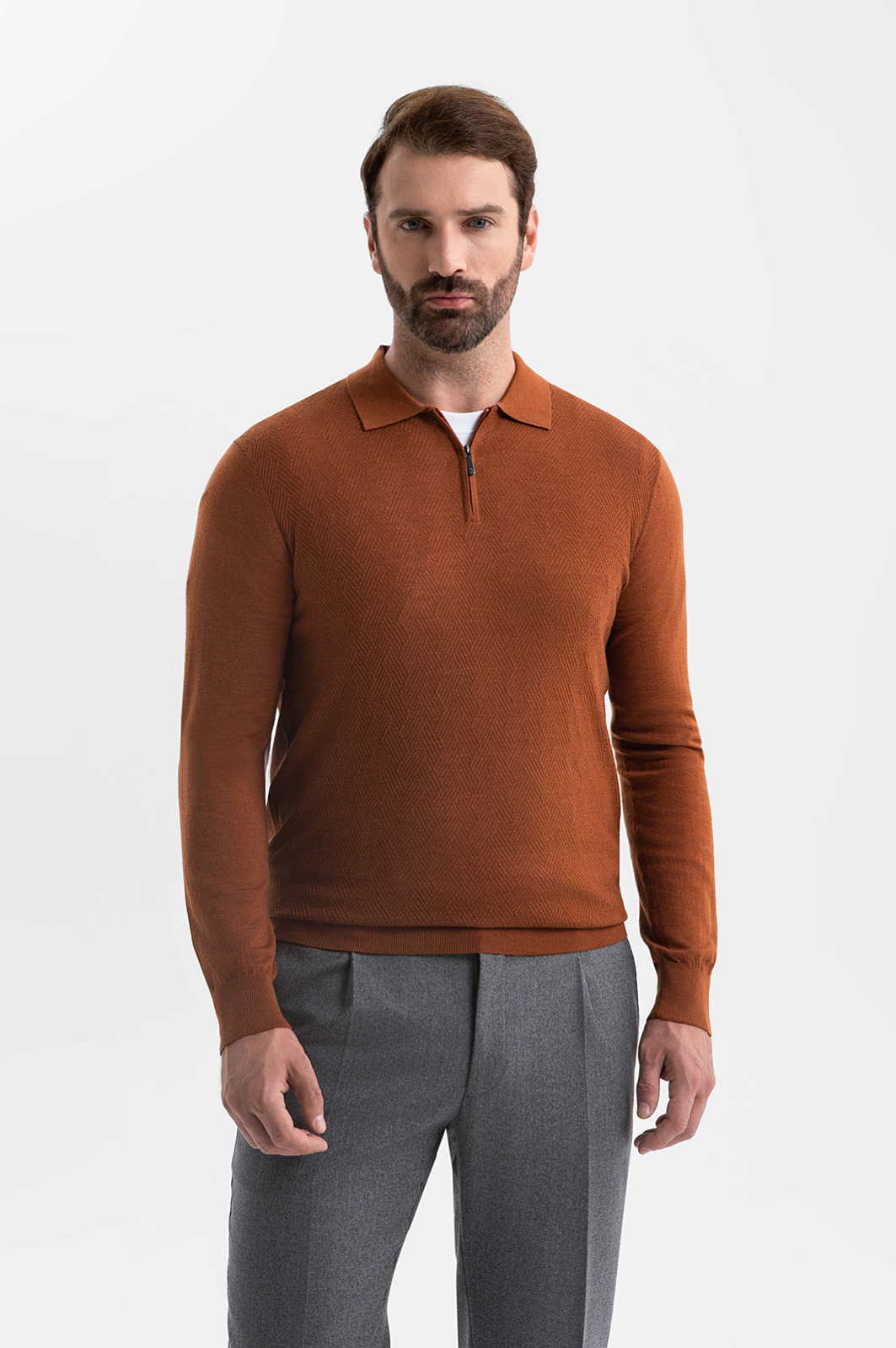 Джемпер поло KANZLER с молнией — гармония фактуры и цвета. Приятный охристый оттенок наполняет образ теплом и благородством, позволяя создавать как строгие, так и более расслабленные аутфиты для отдыха и путешествий. Передняя часть выполнена из фактурного трикотажа, который придаёт джемперу выразительность, создавая лёгкий объём. Спинка и рукава из гладкого трикотажа формируют аккуратный силуэт и подчёркивают чистоту линий, делая модель универсальной и современной. Мягкий воротник-поло добавляет элегантности. Состав из натуральных волокон обеспечивает идеальный баланс практичности и изысканности. Шерсть дарит тепло, прочность и комфорт, а шёлк добавляет ткани мягкость и лёгкий благородный блеск. Параметры модели: рост 189, 102-80-99 Размер на модели: M