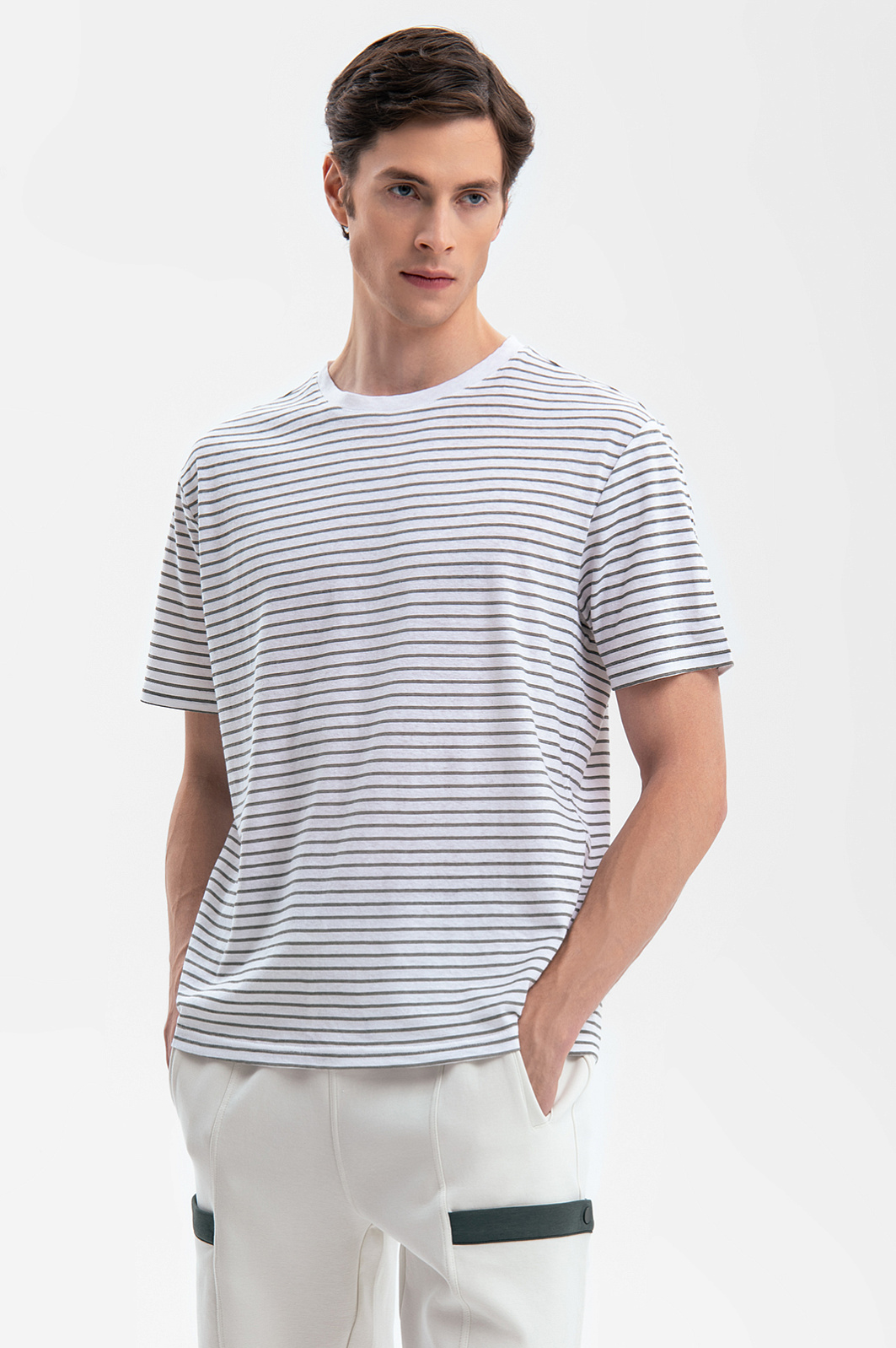 Футболка KANZLER в полоску – формула вашего комфорта. Свободный крой, экологичный долговечный материал и универсальный фасон – модель будет радовать своим качеством на протяжении многих сезонов. Для ее создания выбрали материал, объединивший лучшие свойства льна и хлопка: мягкая ткань отлично сохраняет форму, не растягиваясь, и сохраняет комфорт в жаркий день – гигроскопичная ткань быстро впитывает влагу и дарит ощущение прохлады. Свободный крой обеспечивает абсолютную свободу движения. Сочетайте футболку с оливковыми бермудами и эспадрильями или дополните темно-синими джинсами и кедами для городского образа. Параметры модели: рост 189, 91-78-95 Размер на модели: М