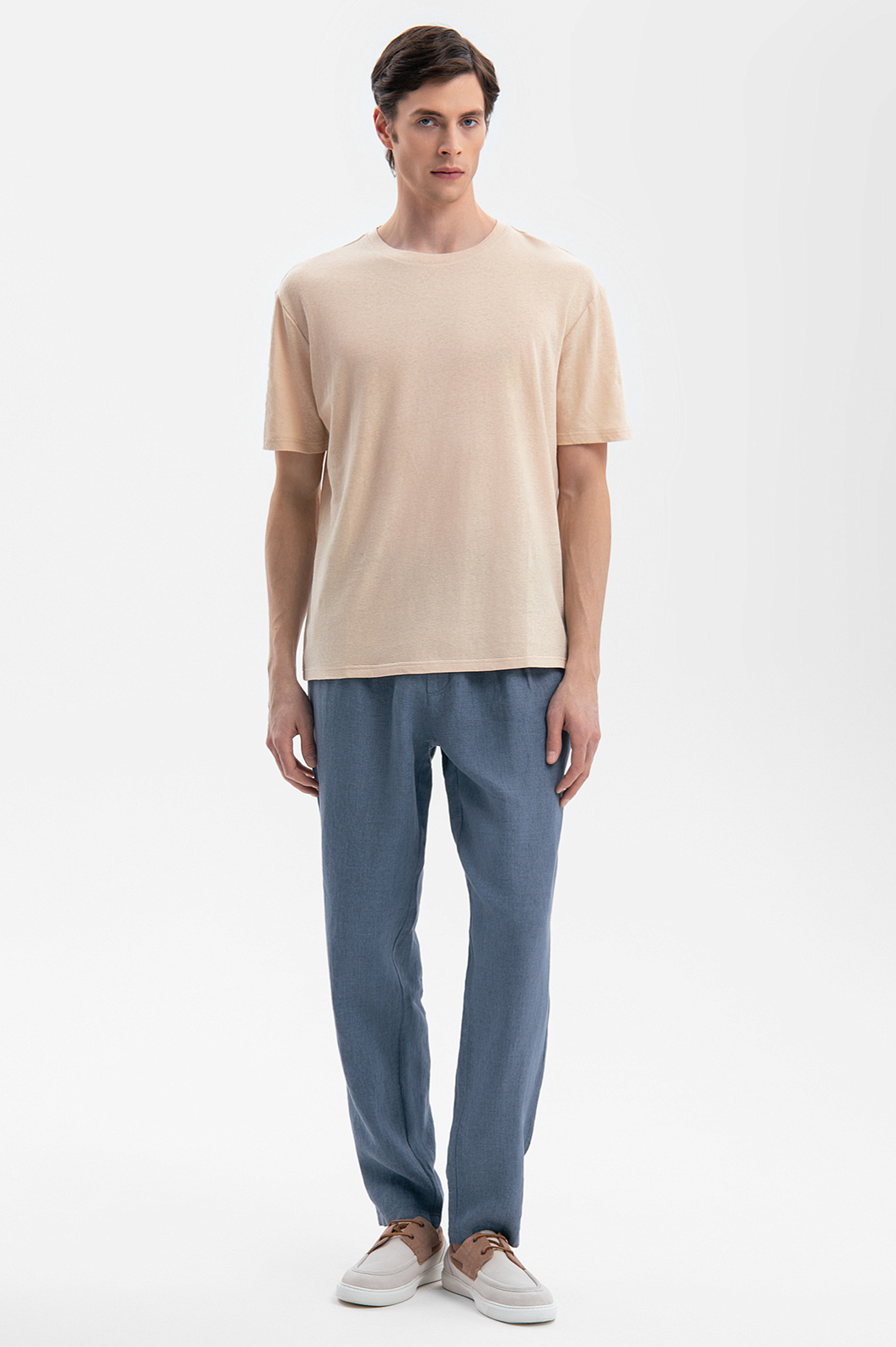 Футболка – ключевой элемент весенне-летнего гардероба. В новой коллекции дизайнеры KANZLER уделили особое внимание моделям, в которых для комфорта в теплое время года предусмотрено все. Бежевая футболка выполнена из натурального льна (55%) и хлопка (45%). Легкий смесовый материал отлично впитывает влагу, быстро сохнет и обеспечивает терморегуляцию, охлаждая кожу в жаркий день. Даже после многократных стирок футболка сохраняет форму и благородную матовую фактуру, характерную для премиального льна. Свободный крой не стесняет движений и подходит любому типу фигуры. Бежевый оттенок, благородный и универсальный, легко интегрируется в любой гардероб. Сочетайте футболку с льняными брюками и эспадрильями для городской прогулки, комбинируйте с рубашкой оверсайз и кроссовками в стиле городской кежуал или брюками и лоферами – для вечернего выхода. Параметры модели: рост 189, 91-78-95 Размер на модели: М