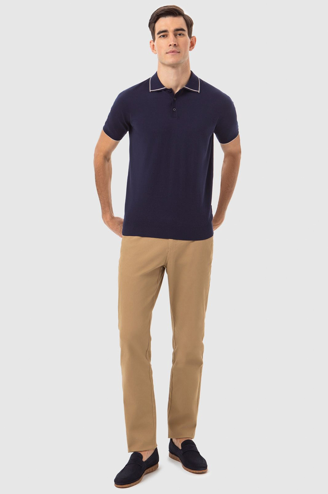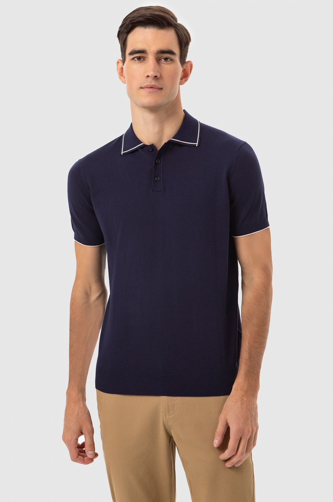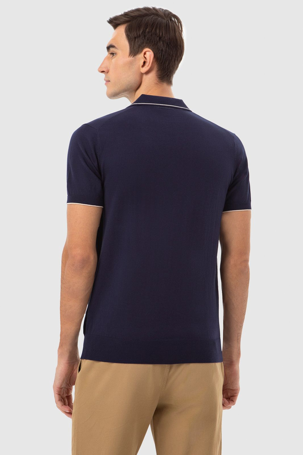 Стильное поло KANZLER оценят любители минималистичной роскоши. Деликатная белая полоска на мягком отложном воротнике и манжетах в сочетании с глубоким темно-синим цветом задает морской характер модели. Поло подойдет для любого сезона. У него традиционный прямой крой — ткань не облегает тело, а лишь обозначает контуры. Мягкое джерси из дорогого чистого хлопка великолепно смотрится на любом типе фигуры. Натуральные волокна пропускают воздух и отводят лишнюю влагу, создавая ощущение комфорта во время отдыха, подвижных игр, прогулок и спортивных занятий. Параметры модели: рост 192, 101-76-97 Размер на модели: M