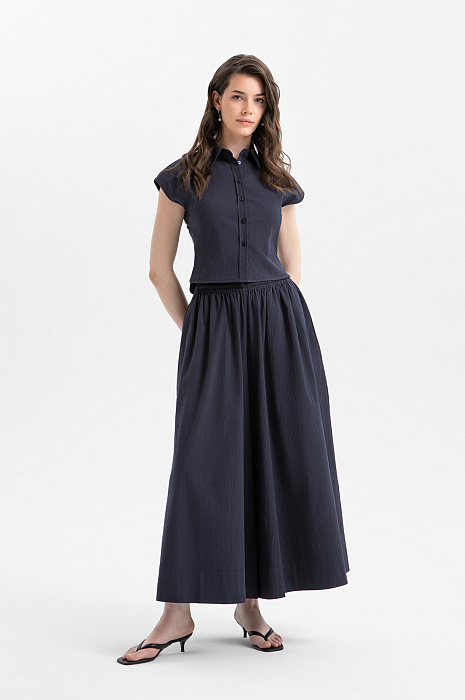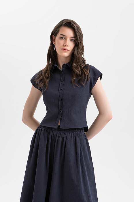 Эффектный сет KANZLER глубокого синего цвета — гармоничное сочетание лаконичной блузки и современных кюлотов, создающее стильный и комфортный образ для тёплого сезона. Блузка с небольшими рукавами-крылышками отличается Т-образным силуэтом и подчеркнутой зауженной талией. Кюлоты с широкими укороченными штанинами задают женственный силуэт и красиво раскрываются в движении, подчёркивая лёгкость и романтичность образа. Ткань с деликатной фактурой выполнена из натурального гипоаллергенного хлопка (97%) с добавлением спандекса (3%). Это приятный к телу и слегка эластичный материал, который поддерживает естественную циркуляцию воздуха и хорошо сохраняет форму.