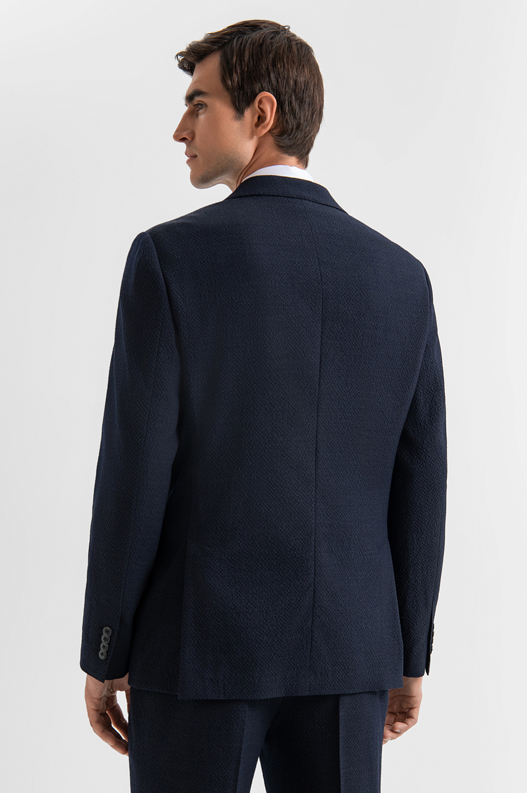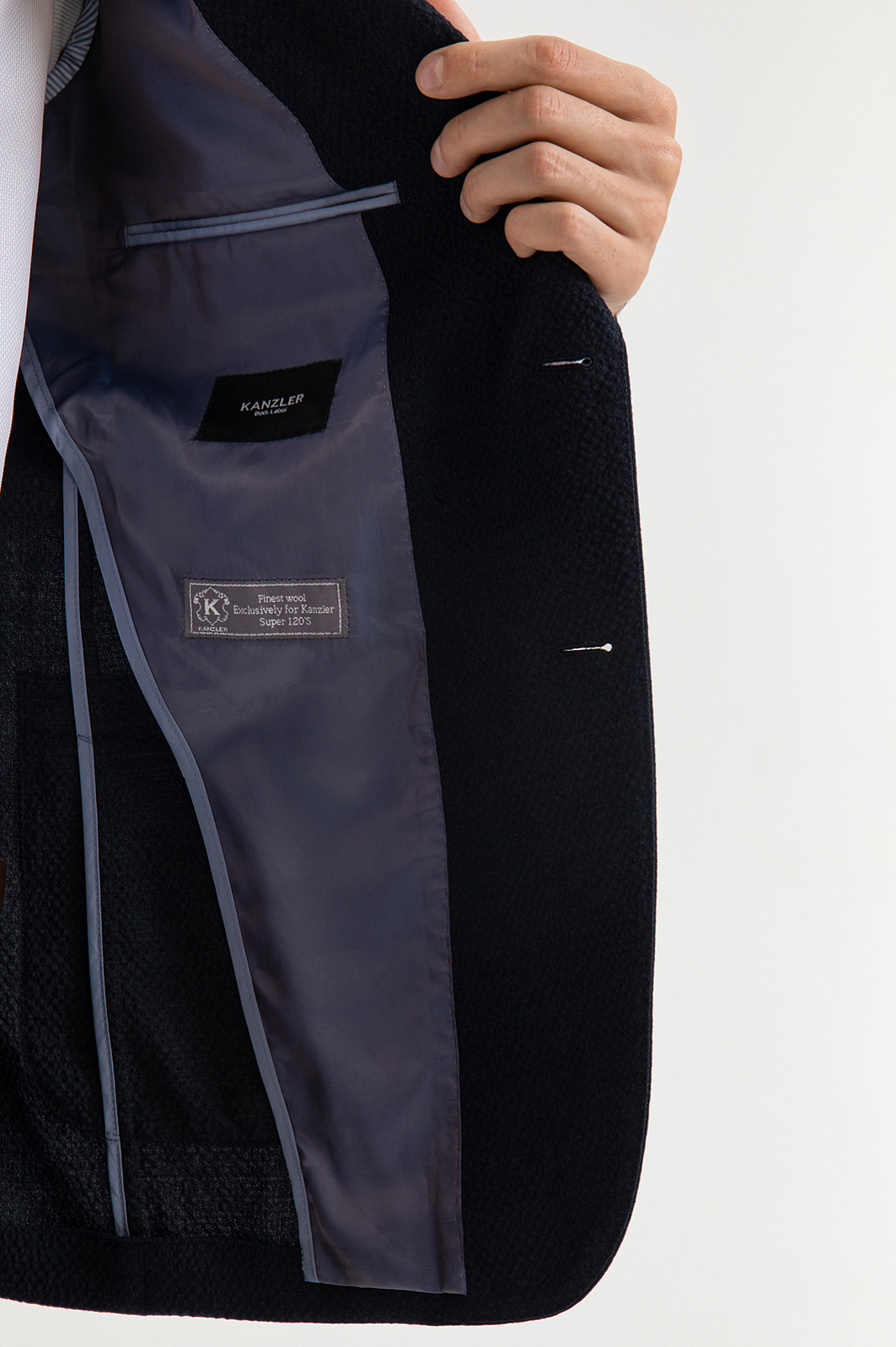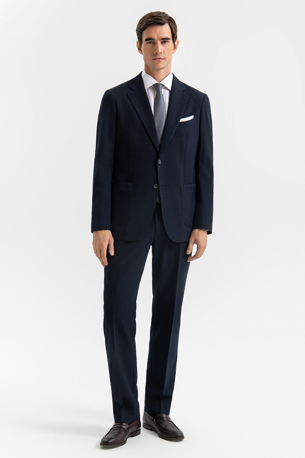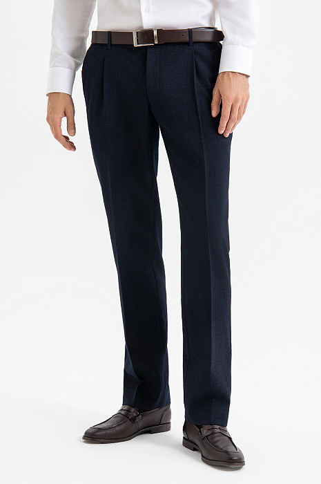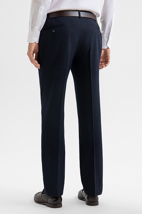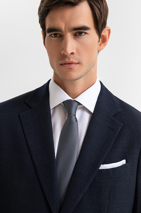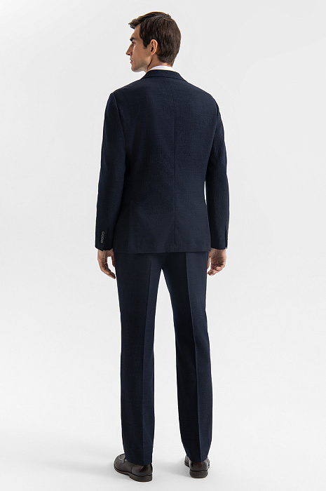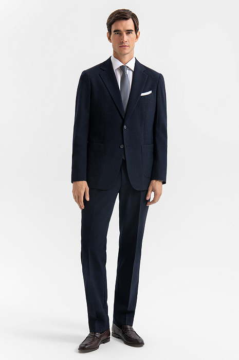 Роскошный костюм-двойка KANZLER из фактурной тонкой шерсти мериноса глубокого синего цвета — современное прочтение классики для тех, кто ценит стиль, комфорт и уверенность в образе. Он подойдёт для неформальных деловых встреч, работы в офисе и публичных выступлений. Пиджак прилегающего кроя с частичной подкладкой и накладными карманами придаёт образу собранный и динамичный вид. Брюки слегка зауженного силуэта со стрелками и мягкими защипами на талии выглядят элегантно и строго, оставаясь комфортными. Материал высокого качества — дорогая костюмная шерсть Супер 120S с добавлением 3% эластана — обладает мягкой текстурой, воздухопроницаемостью и лёгкой эластичностью, которая обеспечивает отличную посадку.