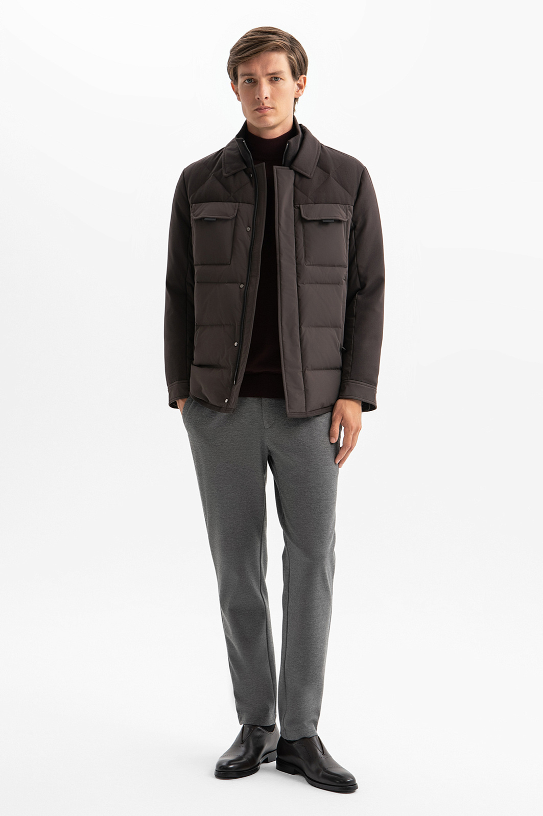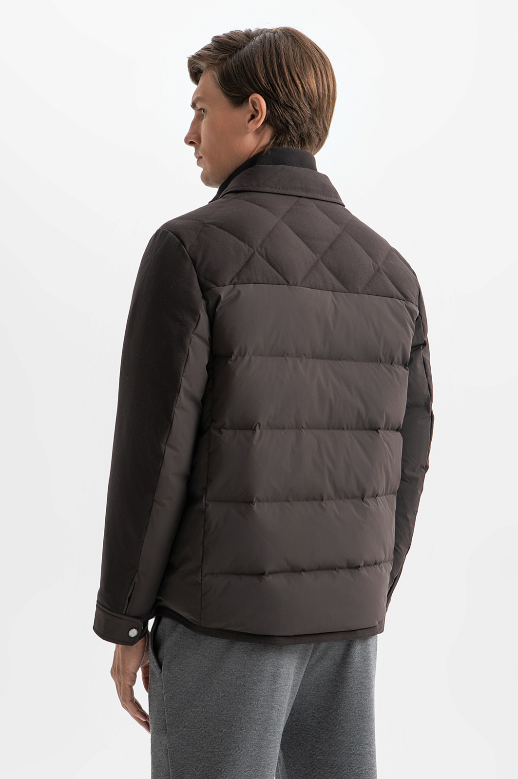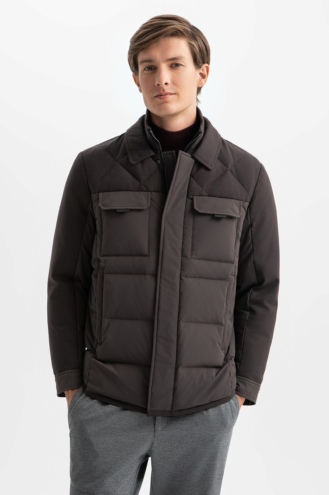 Темно-коричневая стеганая куртка KANZLER с натуральным наполнителем — идеальный выбор верхней одежды для холодных дней. Функциональные детали — большие верхние карманы с клапанами, планка, прикрывающая молнию, манжеты с застежкой-кнопкой придают модели строгий функциональный вид. Мягкий отложной воротник, матовые материалы, разные виды строчки, образующие горизонтальные линии и ромбы, добавляют элегантности. Верхний водоотталкивающий слой защищает от дождя, снега и ветра. Основная часть куртки сшита из прочнейшего полиамида с добавлением спандекса. Плечи и рукава — из смесовой шерстяной ткани. Внутри — теплый наполнитель из пуха (80%) и пера (20%). Подкладка выполнена из практичного гладкого полиэстера. В теплых боковых карманах можно согреть руки. Место для хранения важных мелочей — просторный внутренний карман с молнией. Параметры модели: рост 191, 97-77-99 Размер на модели: 50