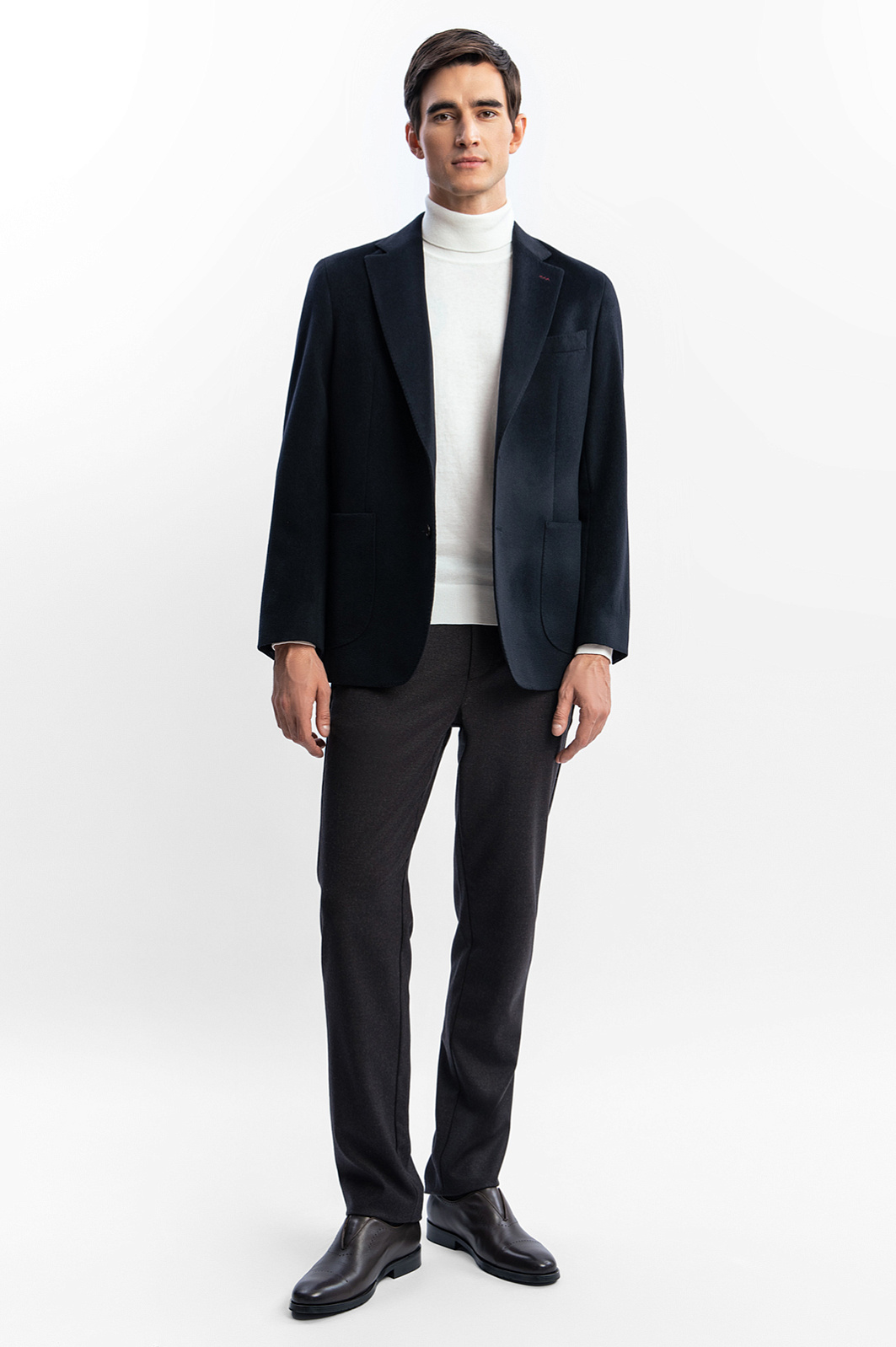 Темно-синий пиджак KANZLER из коллекции изысканной одежды из дорогих тканей — роскошь, созданная по канонам высокого портновского искусства из чистого кашемира — нежного натурального материала премиального качества. Мягчайшая ткань создает ощущение нежного заботливого прикосновения. Однобортный пиджак с прямыми лацканами и двумя шлицами сзади скроен достаточно свободно, чтобы не ограничивать движения. Обметка петлицы, ручной декоративный шов на подкладке, курсивная вышивка, рамка и атласный уголок на внутреннем кармане выполнены в шоколадно-коричневом оттенке. Прочная скользящая ткань подкладки облегчает надевание. Параметры модели: рост 192, 101-76-97 Размер на модели: 50