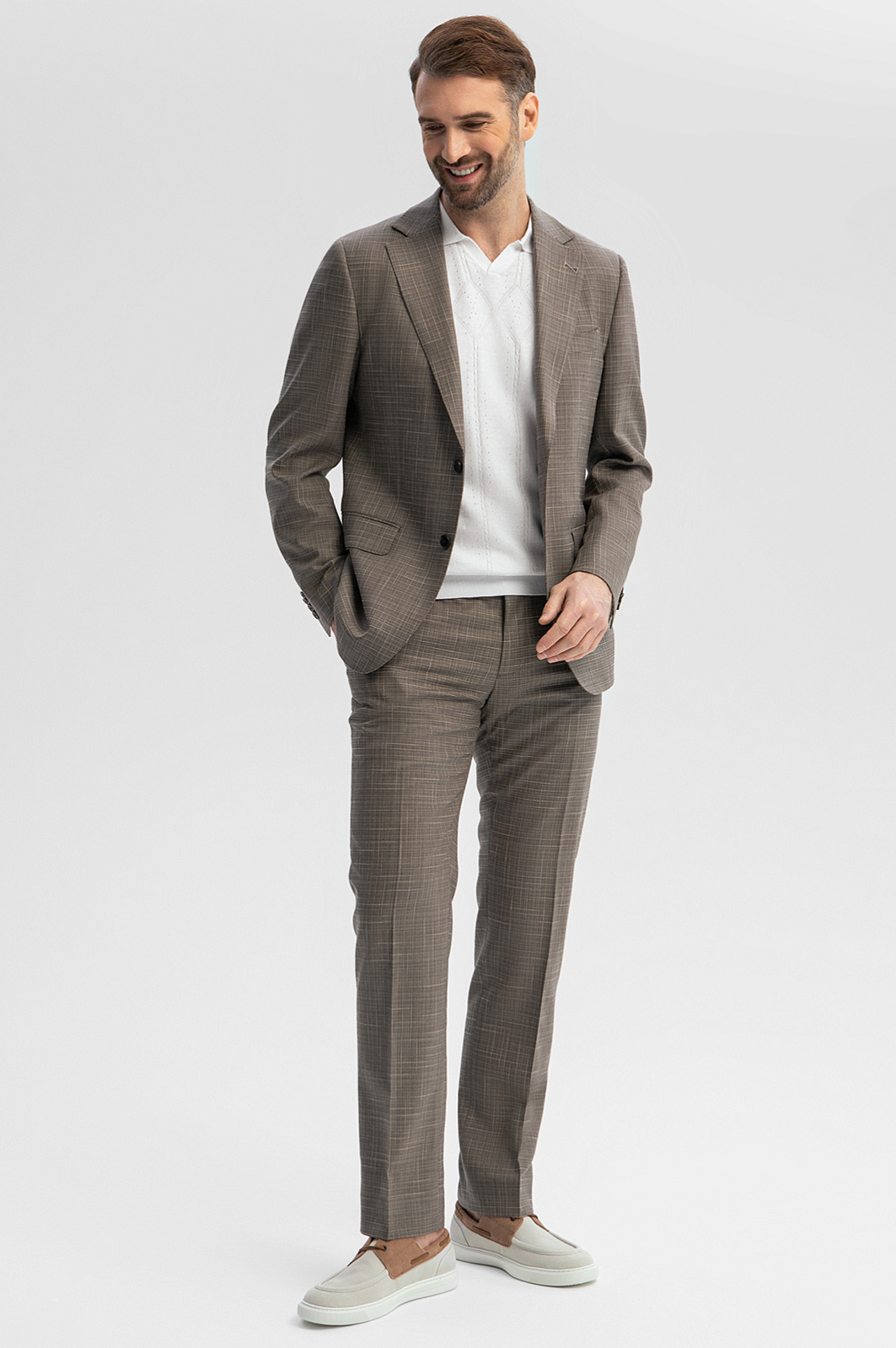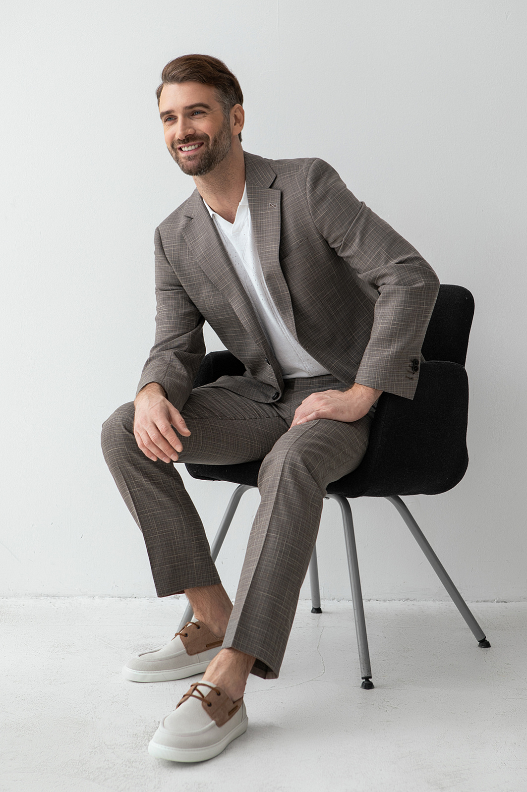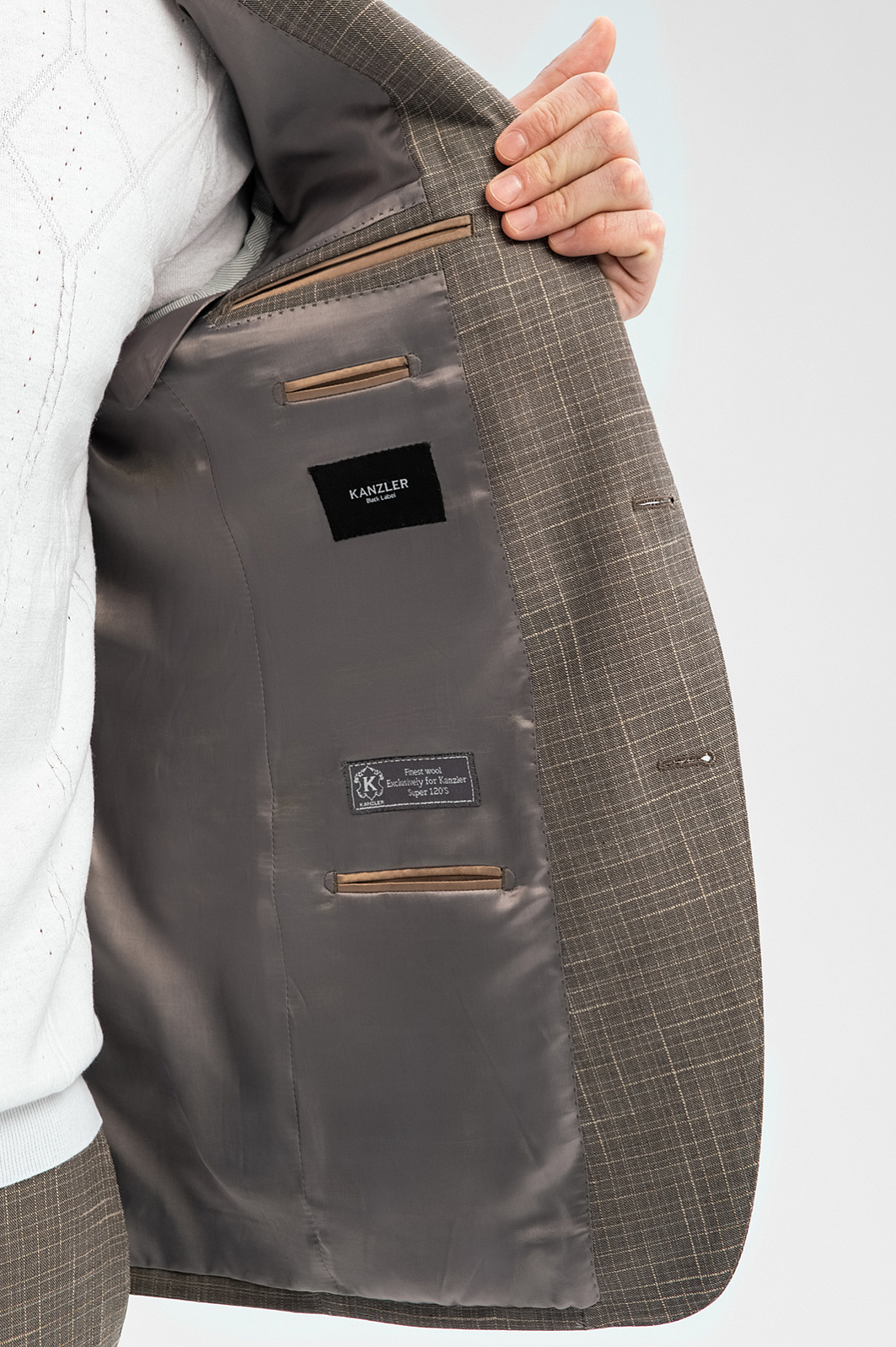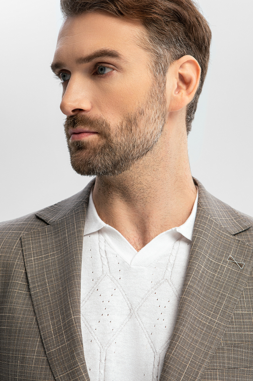Светло-коричневый однобортный пиджак KANZLER из шерсти, хлопка и льна с водоотталкивающей обработкой — пример элегантности, которая вписывается в современный ритм жизни. Рисунок в тонкую клетку добавляет образу легкости. Приталенный силуэт подчеркивает главные константы мужской фигуры — широкую линию плеч и узкую линию талии. Вышивка на лацкане служит небольшим стильным акцентом. Роскошная костюмная ткань — долгосрочная инвестиция в собственный комфорт и безупречность. Благодаря особой водоотталкивающей обработке материал не боится повышенной влажности и загрязнений, но сохраняет паропроницаемость. Тонкие упругие волокна шерсти Супер 120S (90%) хорошо держат форму. Хлопок и лен обеспечивают теплорегуляцию и свежесть тела. Параметры модели: рост 189, 102-80-99 Размер на модели: 50