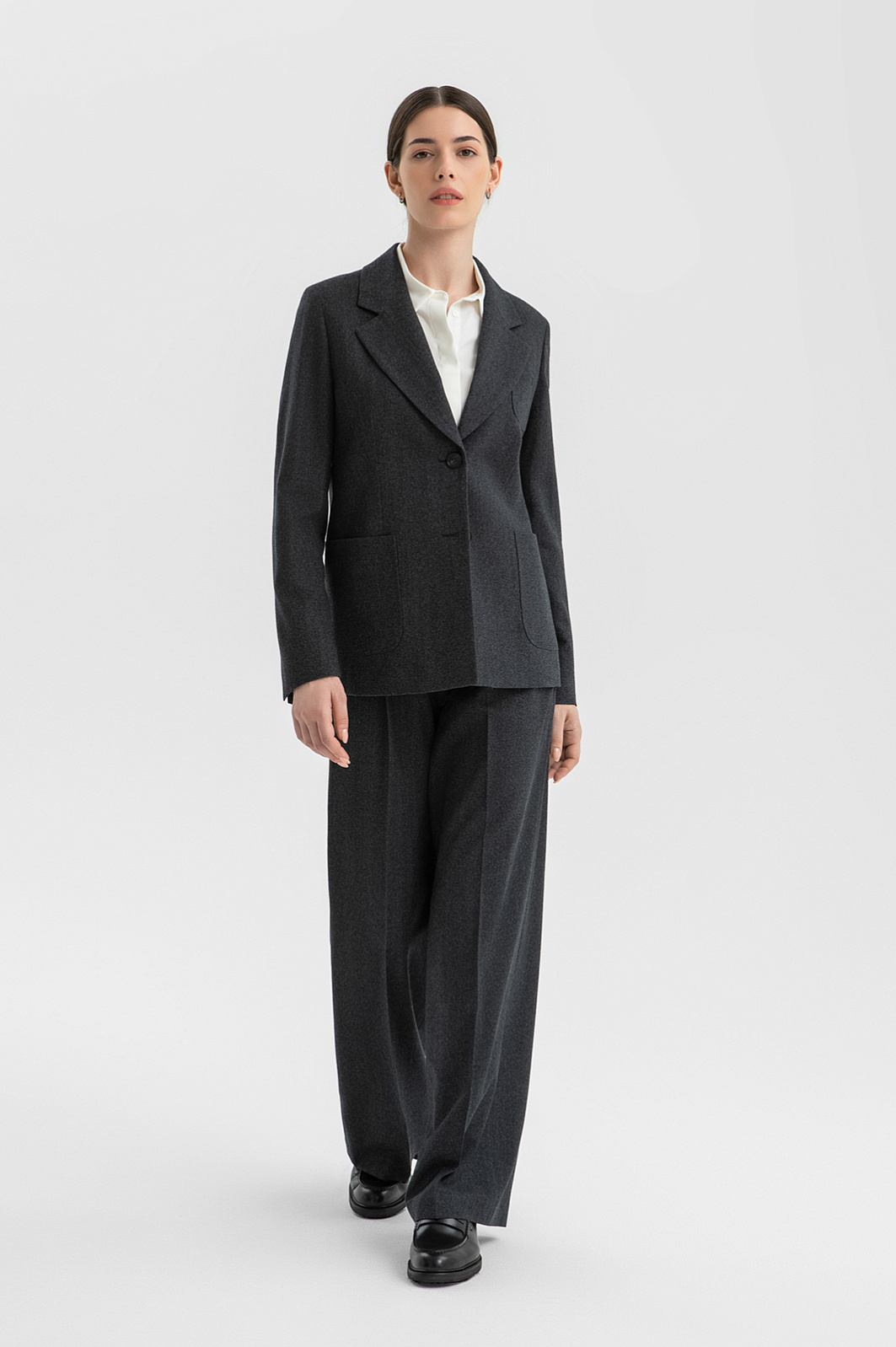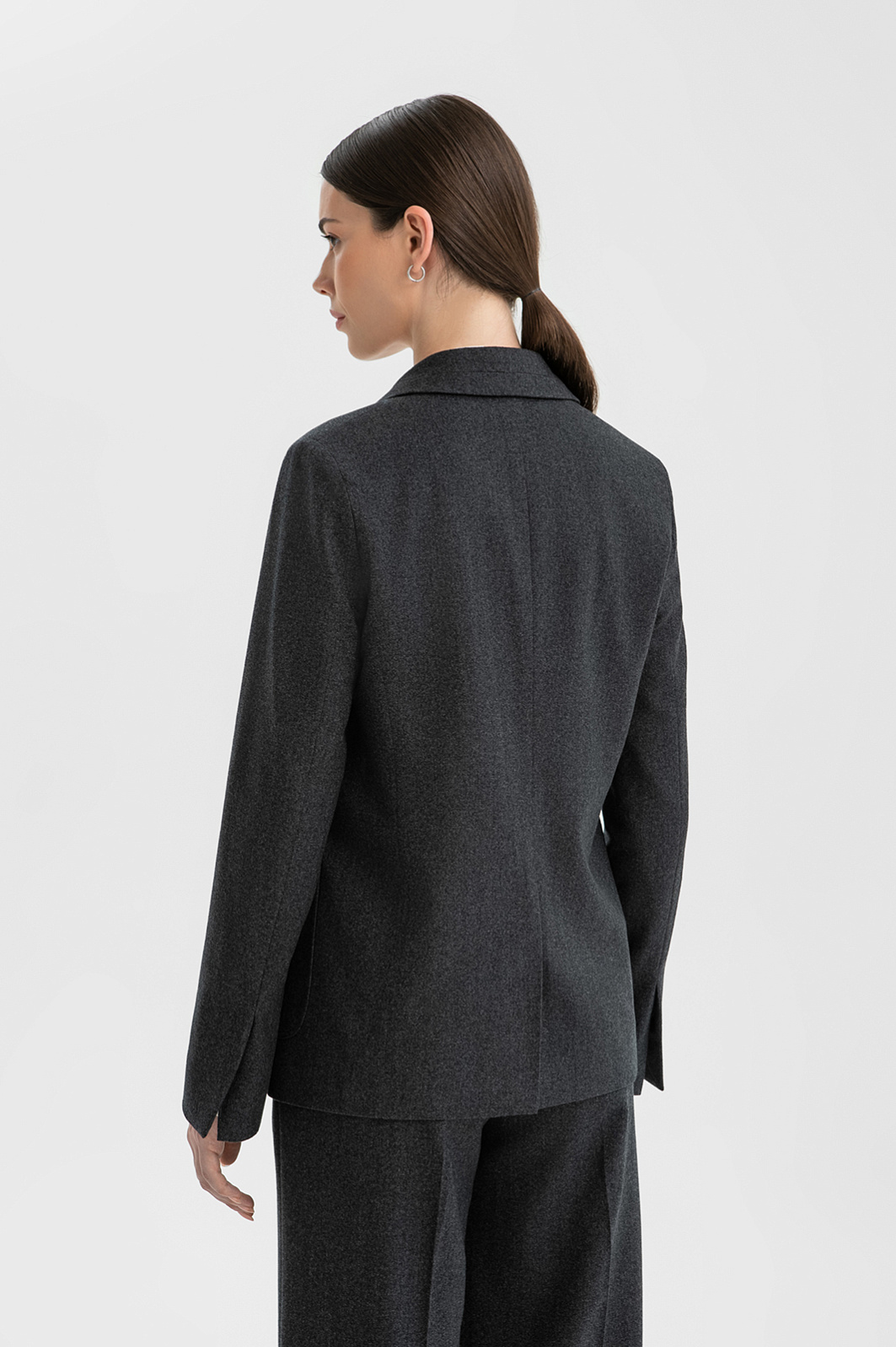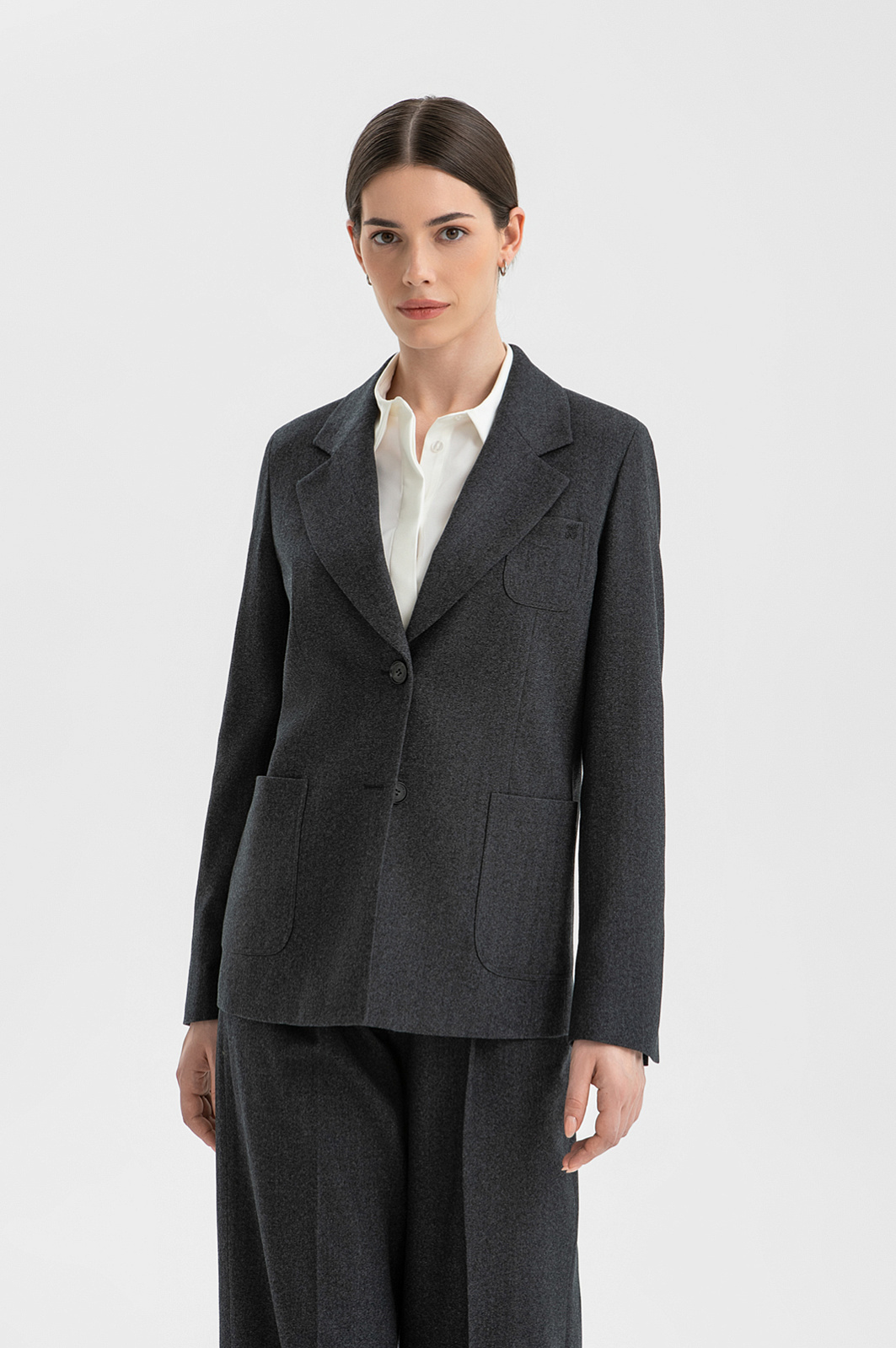 Тёмно-серый пиджак KANZLER из благородной шерсти сочетает строгий элегантный стиль и непринужденность. Модель украшена вышитым фирменным инициалом в тон. Классический крой с широким воротником, лацканами и шлицей сзади дополнен современными деталями — аккуратными накладными карманами и небольшими разрезами на рукавах. Вытачки спереди создают привлекательный женственный силуэт. Ткань из 100-процентной шерсти приятна на ощупь и при этом достаточно структурирована, чтобы поддерживать форму. Это тонкие натуральные волокна, которые хорошо сохраняют естественное тепло тела, не допуская перегревания. Гладкая прочная подкладка сделана из прочного воздухопроницаемого смесового материала (полиэстер и вискоза).