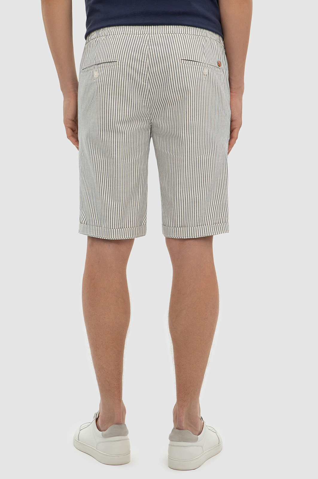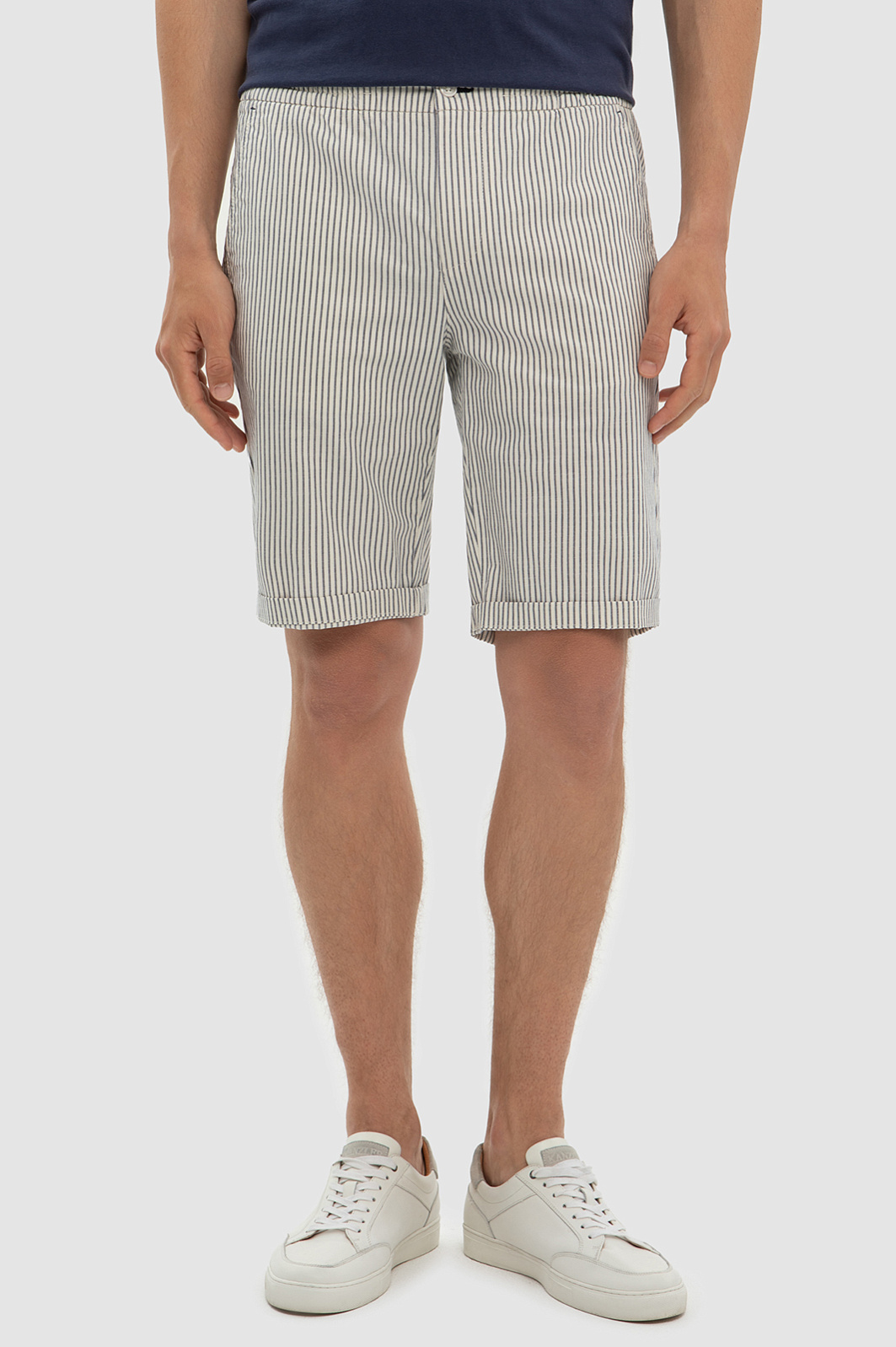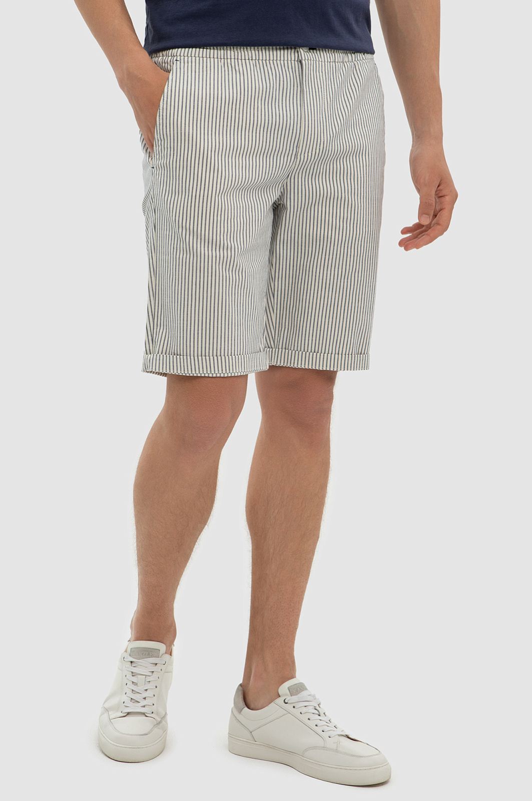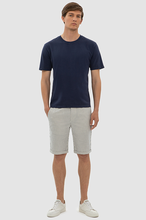 С шортами в полоску любой образ получится расслабленным и комфортным. Тон задает освежающий белый цвет и всегда актуальный принт в полоску. Для пошива этой лаконичной модели использовали гладкий дышащий хлопок с добавлением нитей льна и эластана, благодаря которым изделие не будет сковывать движения. Легкие мужские шорты KANZLER станут незаменимым элементом летнего гардероба, добавляя нотку свежести и стиля в каждый ваш день. Натуральный материал и прямой Классический крой обеспечивают комфорт и легкость в носке. Параметры модели: рост 191, 97-77-99 Размер на модели: 50