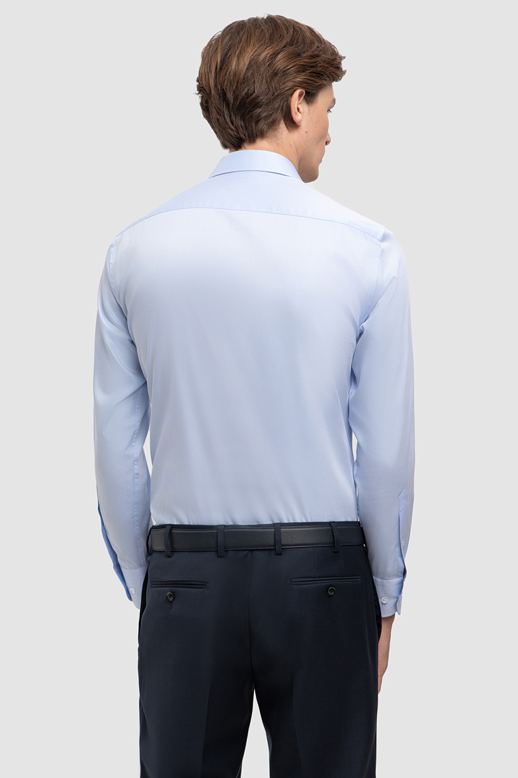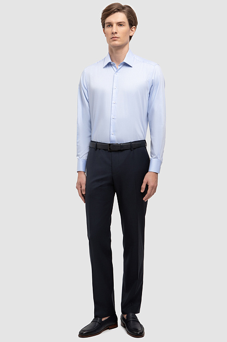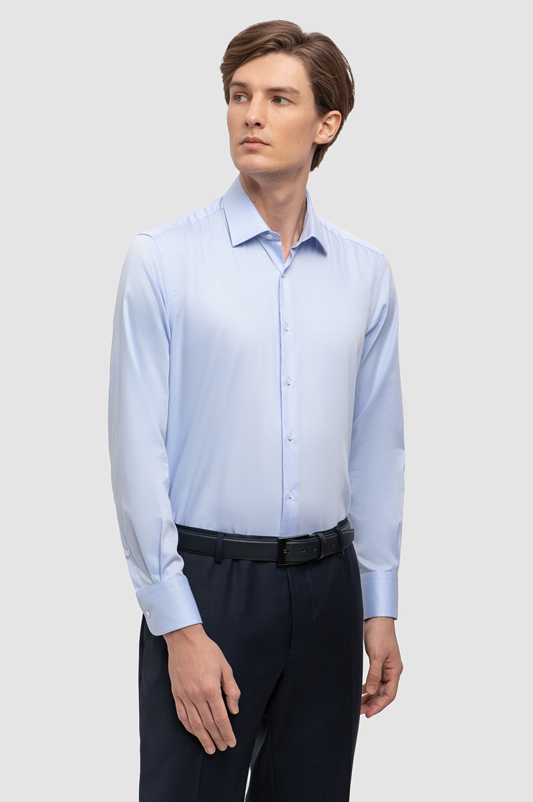 Голубую сорочку KANZLER с воротником кент сшили из тонкого гладкого хлопка. Классический силуэт обеспечивает удобную и комфортную посадку. Гладкая матовая ткань хорошо пропускает воздух, обеспечивая прекрасную воздухопроницаемость, что особенно важно в теплый период. Хлопок с гипоаллергенными свойствами обеспечивает приятные тактильные ощущения и подходит для ежедневной носки. Дополните сорочку брюками синего оттенка и лоферами в тон, чтобы добиться стильного монохромного эффекта, актуального в этом сезоне. Для создания более неформального образа можно расстегнуть верхние пуговицы. Параметры модели: рост 191, 97-77-99 Размер на модели: 40