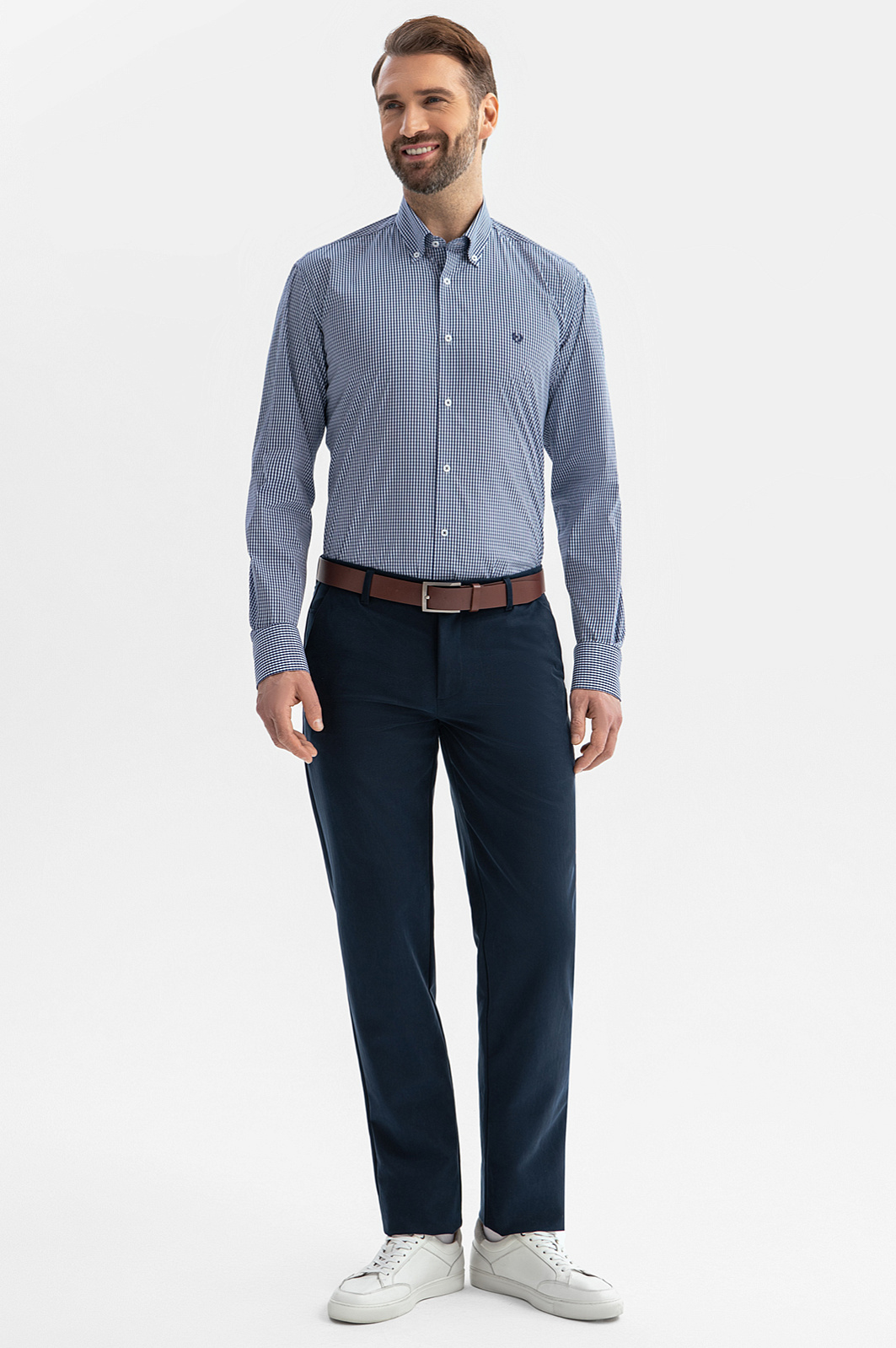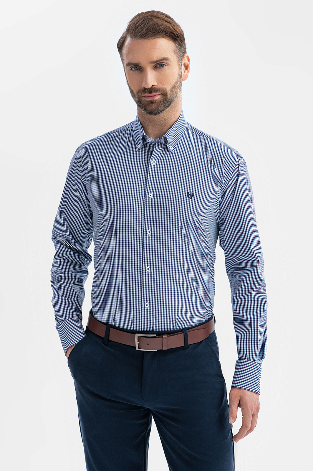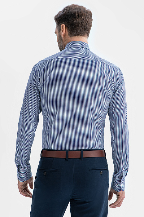 Сорочка KANZLER из эластичной хлопковой ткани в мелкую синюю клетку привнесет легкость и свежесть в повседневный образ. Она подойдет для офиса с нестрогим дресс-кодом и отдыха. Модель украшает небольшая фирменная вышивка на груди. Слегка облегающий крой стройнит и придает сорочке изысканность. Мягкая ткань состоит из натуральных гипоаллергенных волокон хлопка (71%) с добавлением нейлона и спандекса. Материал поддерживает комфортную для тела температуру, не раздражает кожу даже при длительном ношении и отличается практичностью — хорошо держит форму в течение всего дня и не мнется. Параметры модели: рост 189, 102-80-99 Размер на модели: 40