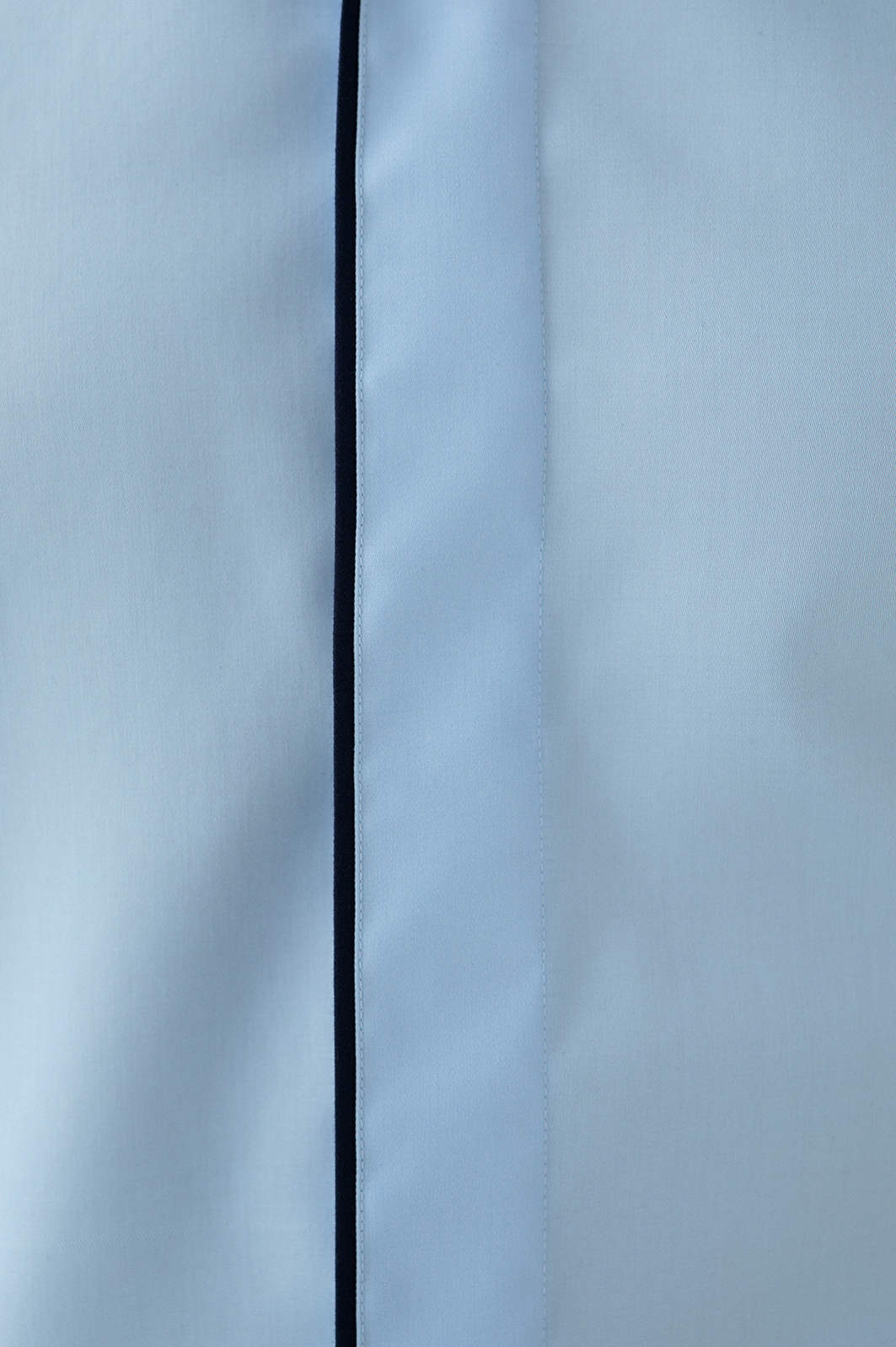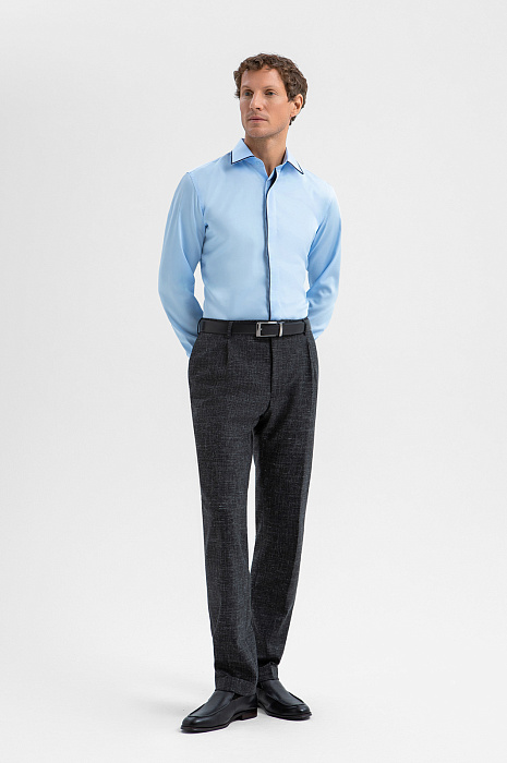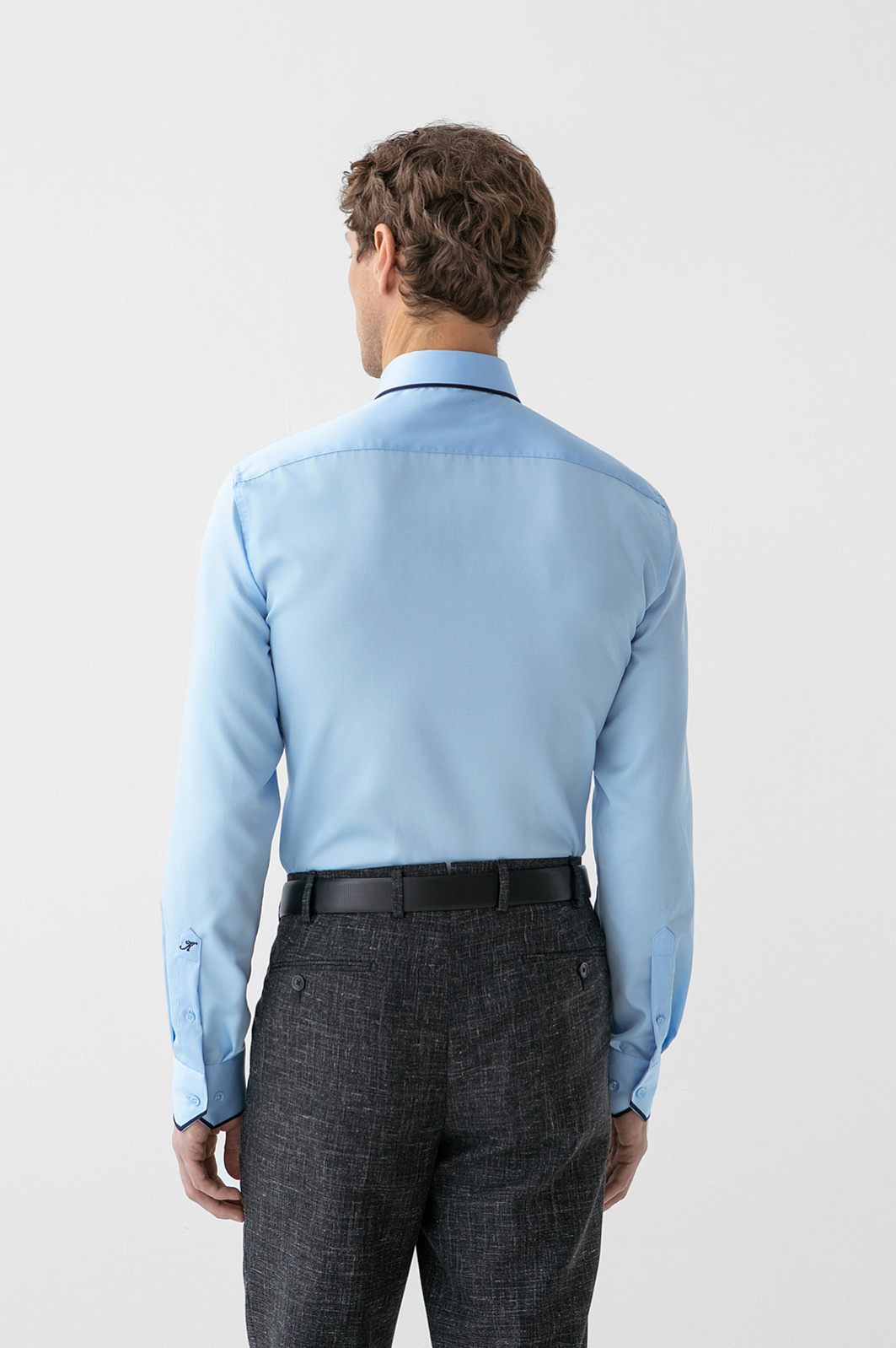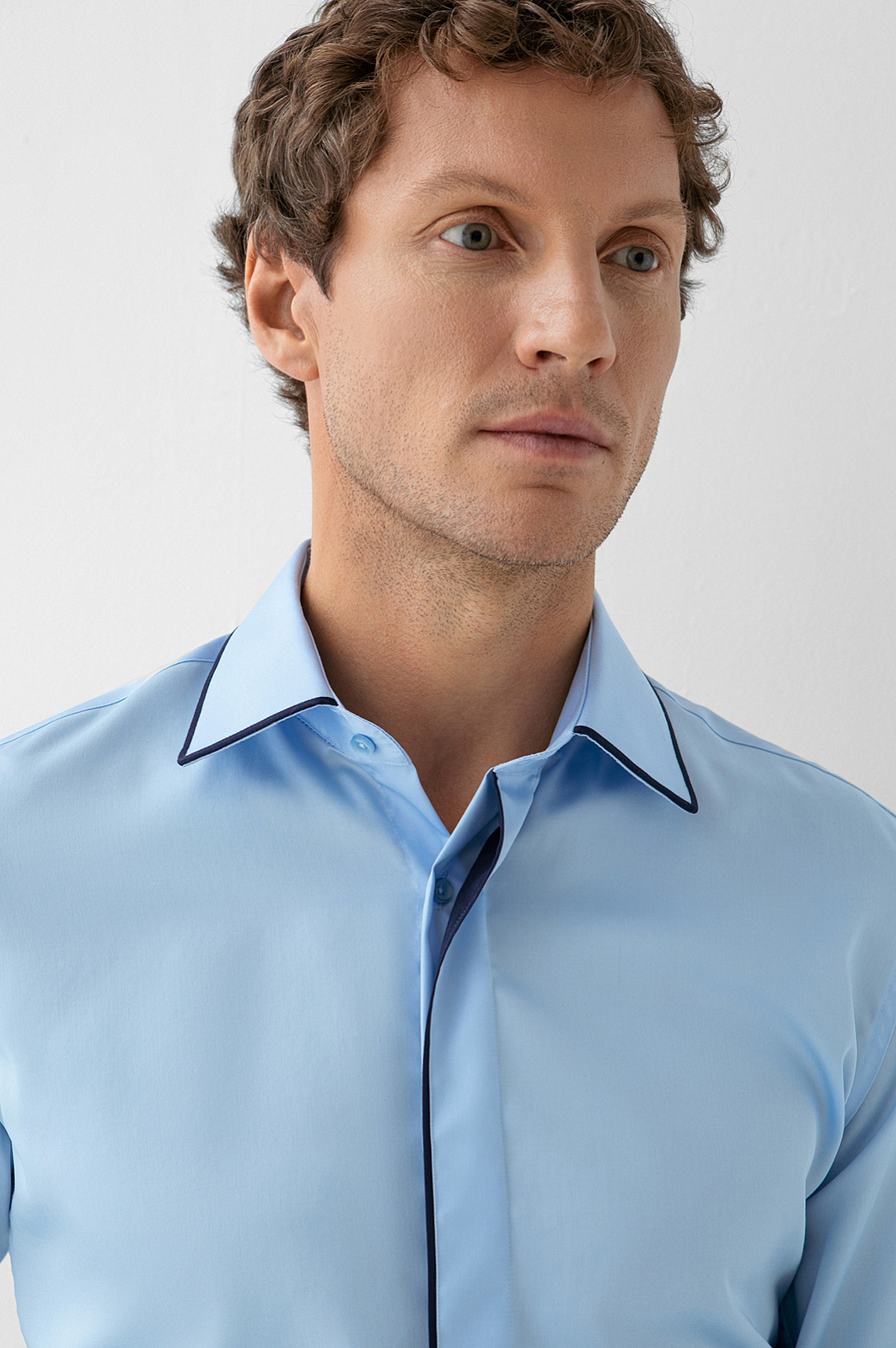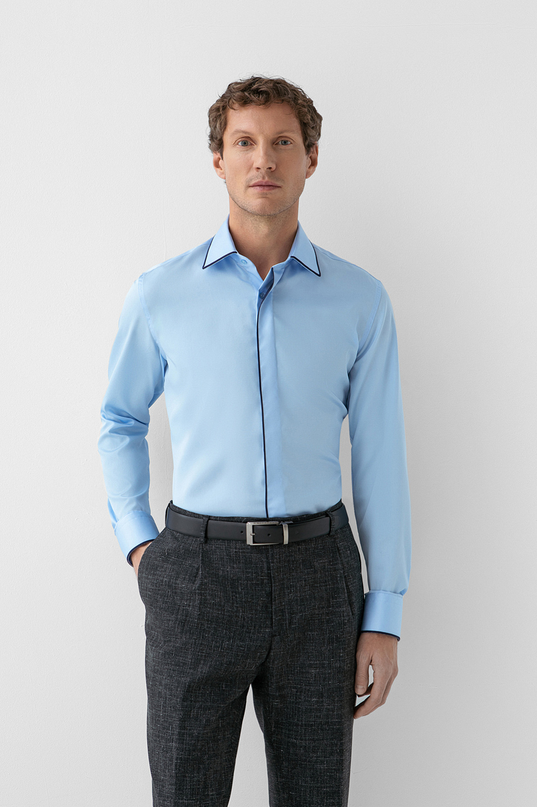 Голубая сорочка KANZLER из чистого хлопка — вещь с изысканными деталями, которые делают её нарядной. Благородный голубой оттенок освежает образ и легко адаптируется к разным сценариям — от деловой встречи до неформального ужина или торжества. Скрытая застёжка формирует идеально чистый фон, который подчёркивает тонкая контрастная полоска по краю планки и воротника. Полуприлегающий крой мягко обрисовывает контуры тела, сохраняя естественность движений. Ткань из лёгкого гипоаллергенного хлопка (100%) с эффектом лёгкой утюжки хорошо держит форму, что особенно удобно, если планы часто меняются и день заканчивается поздно.