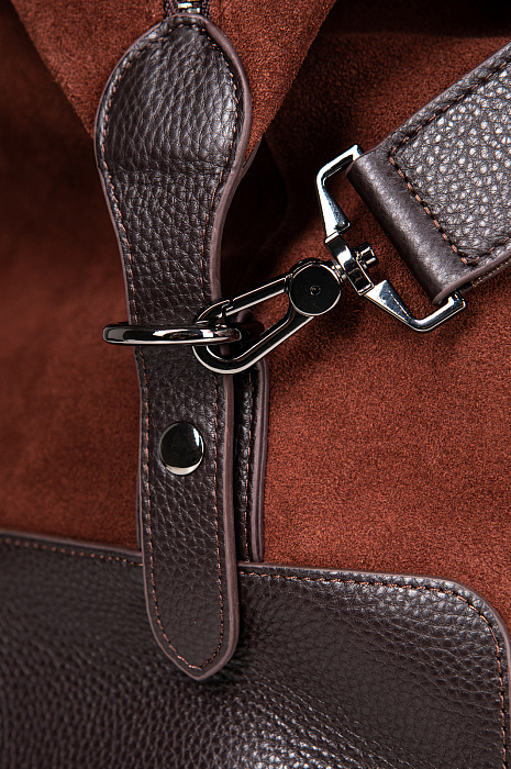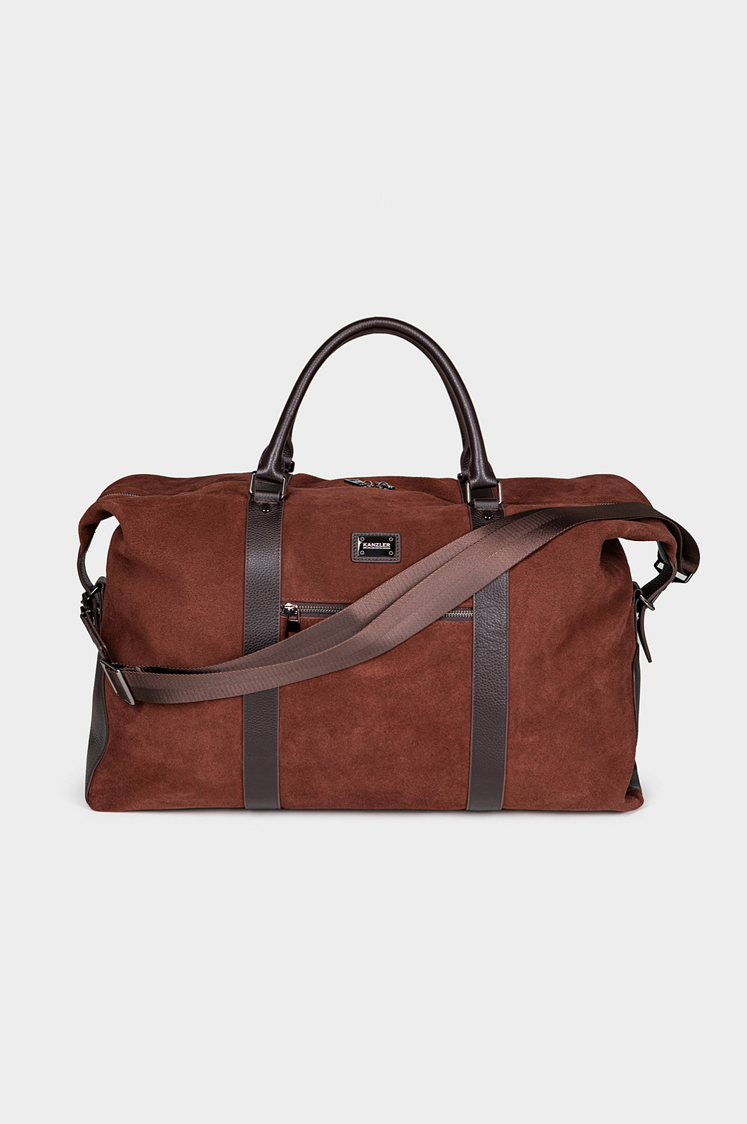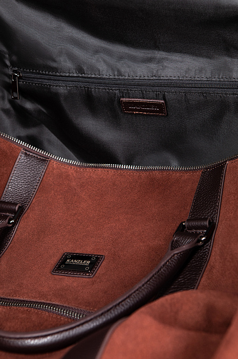 Роскошная дорожная сумка из натуральной кожи и замши KANZLER — больше, чем ручная кладь. Это добротная и стильная вещь, которая будет гармонично смотреться в первом классе самолета и произведет наилучшее впечатление. В сумке из мягкой замши и зерненой кожи превосходной выделки с фурнитурой из блестящего хромированного металла сочетаются оттенки молочного и горького шоколада. Для удобства переноски модель снабжена кожаными ручками и широким текстильным плечевым ремнем. Пять металлических ножек защищают дно от загрязнений и повреждений. Сбоку имеется карман на молнии для мелочей. Внутри — просторное отделение для вещей с подкладкой из крепкой практичной черной ткани, а также внутренний карман на молнии — для документов, карт и денег.