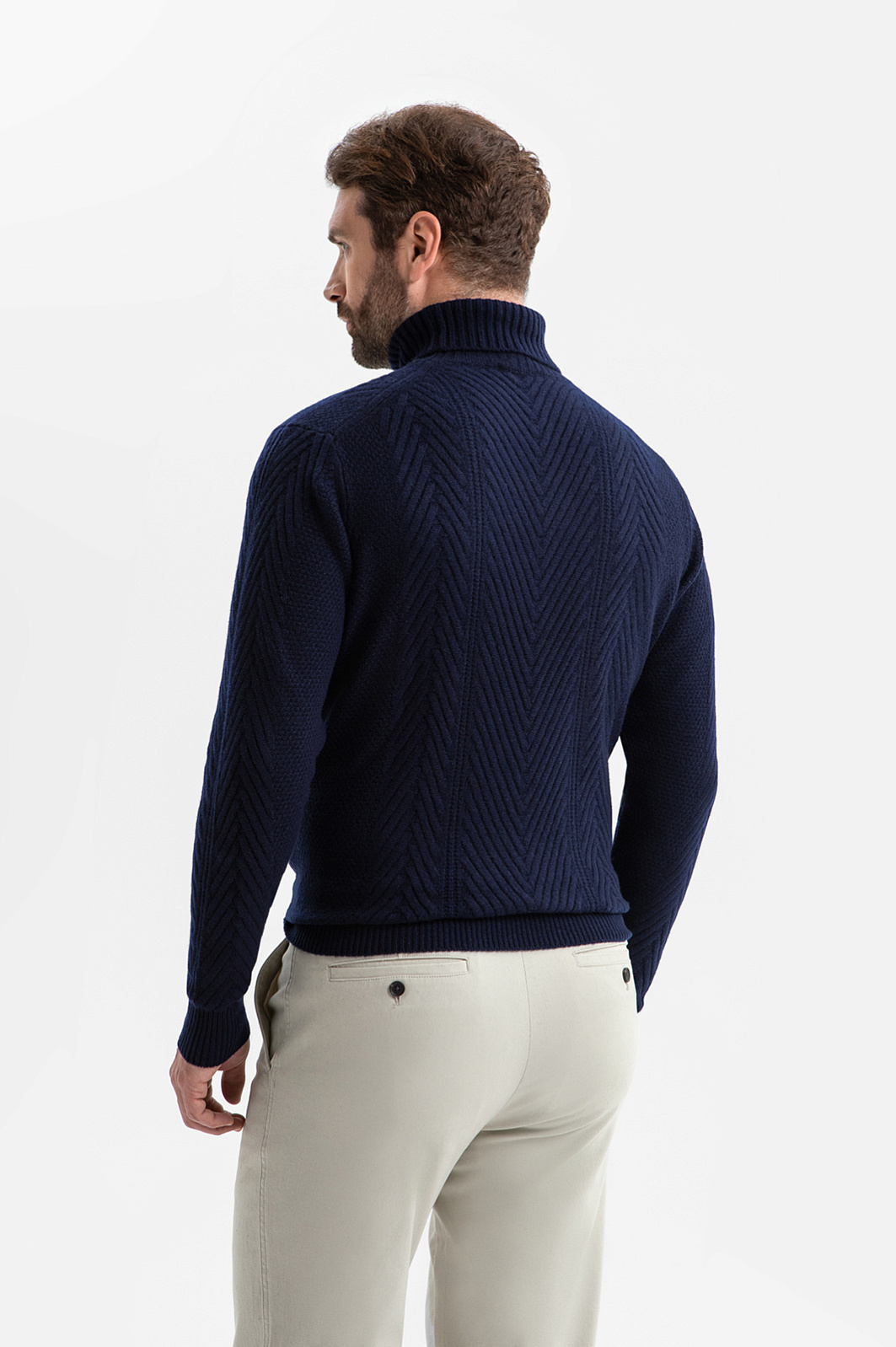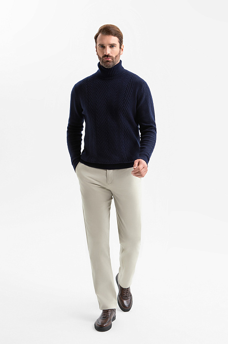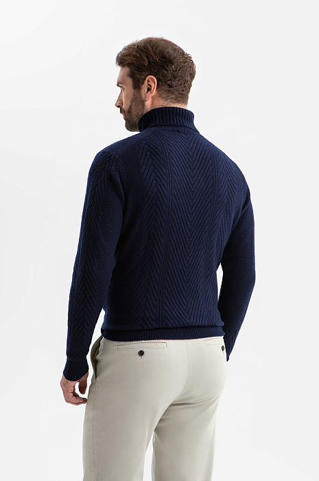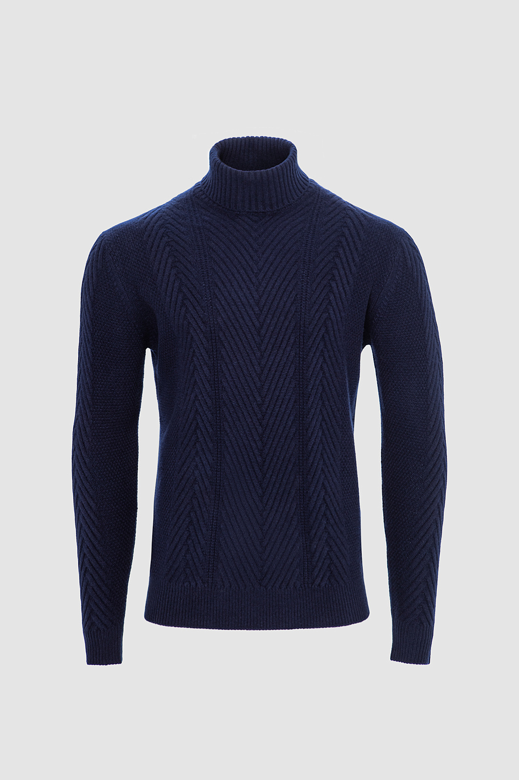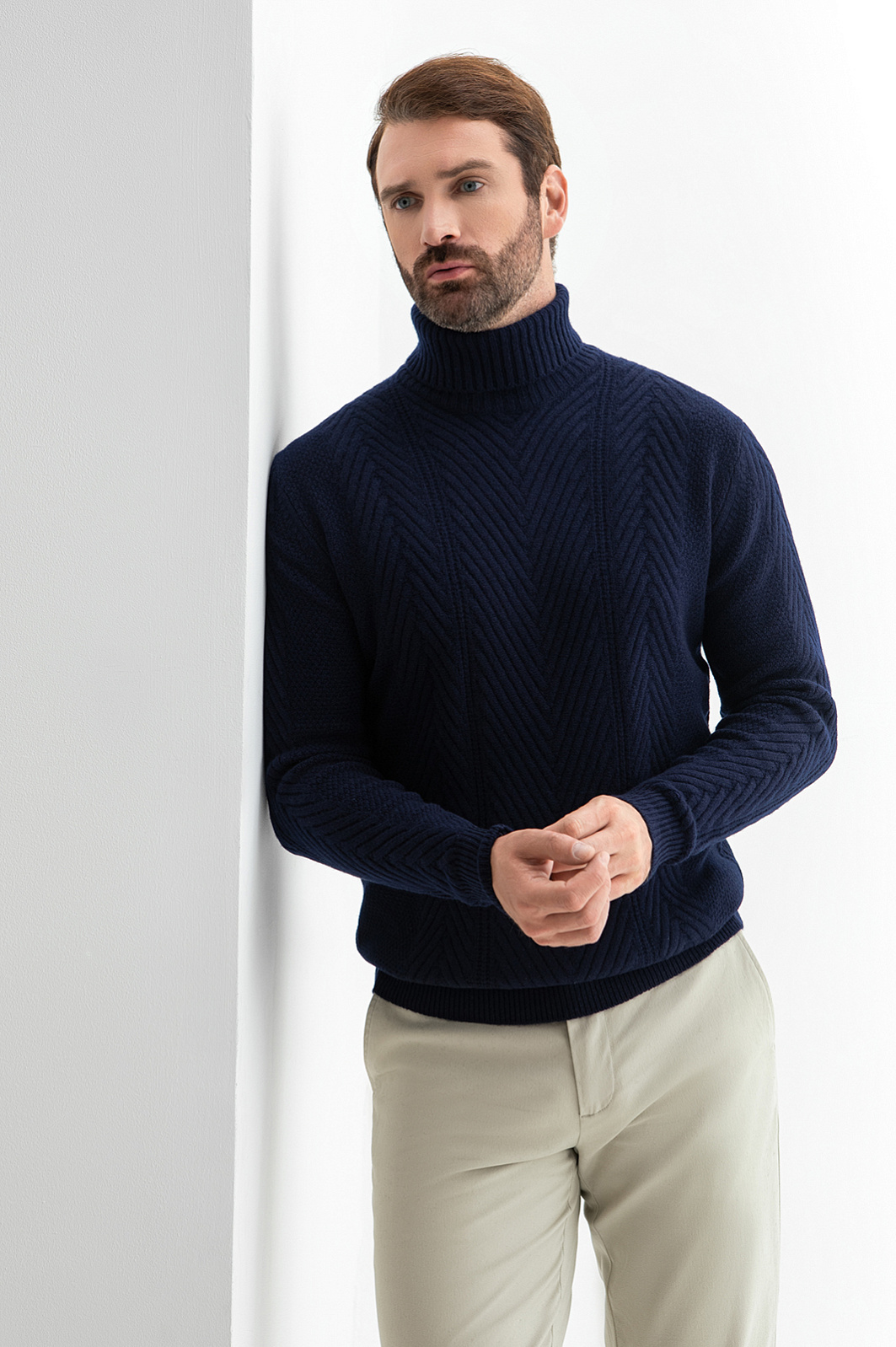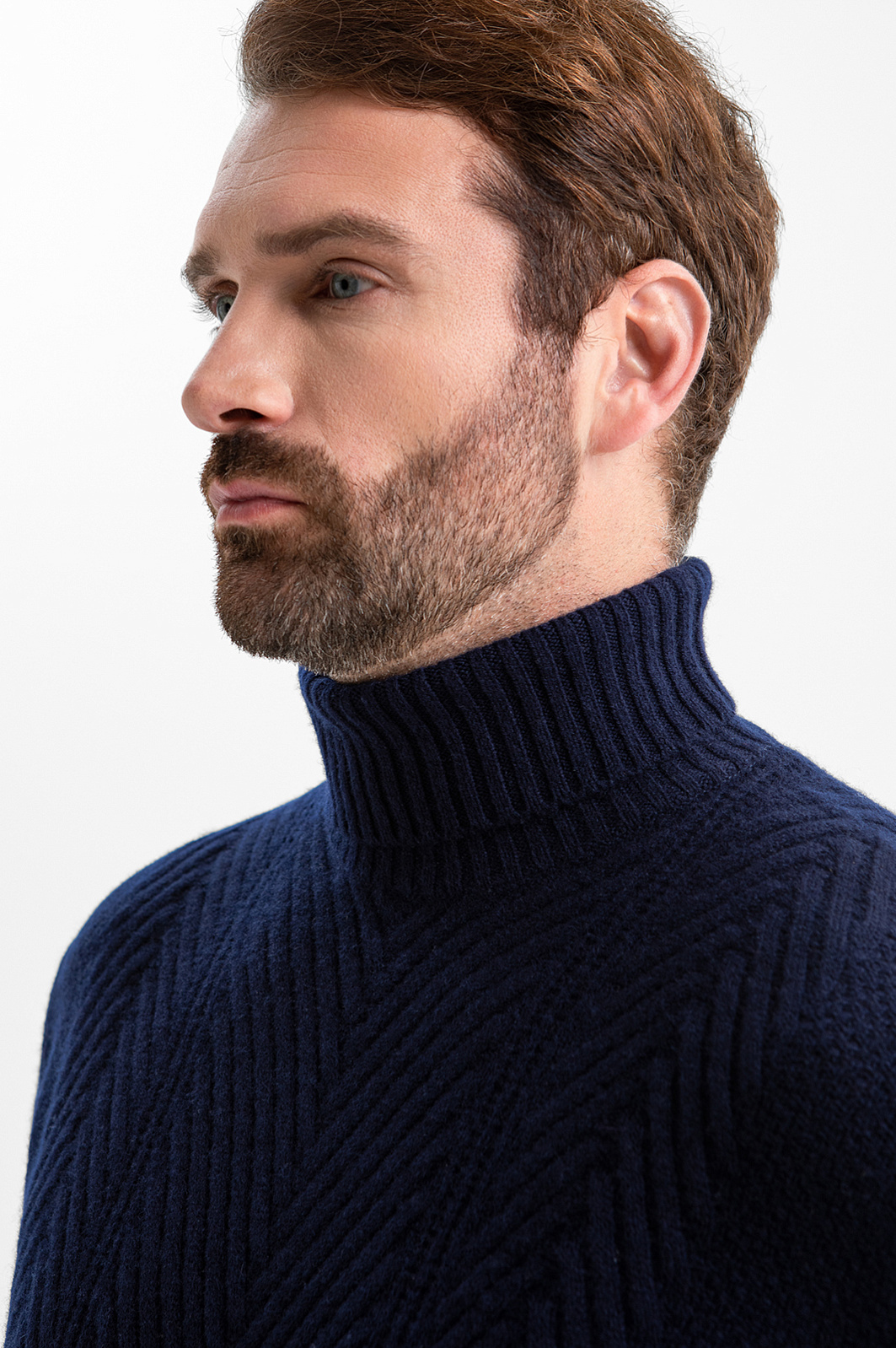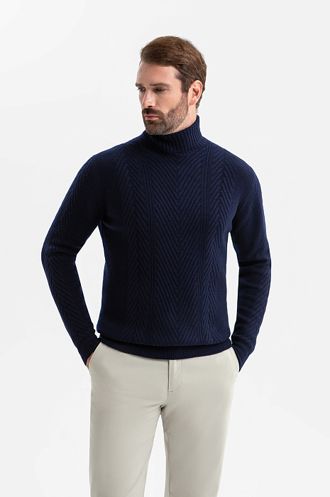 Роскошный свитер KANZLER глубокого чернильного оттенка — идеальный выбор для холодного сезона. Модель с высоким горлом из тёплого трикотажа из шерсти и кашемира защищает от ветра и сквозняков и обеспечивает телу тепло и комфорт. Крупный выразительный рисунок «ёлочка» создаёт эффект глубины и делает образ стильным, гармоничным и современным. Дуэт шерсти и кашемира обеспечивает телу оптимальный микроклимат: упругие волокна шерсти сохраняют комфортную температуру, регулируют влажность, а кашемир придаёт мягкость, нежность и лёгкость. Такой свитер выглядит изысканно, оставаясь при этом практичным выбором на каждый день. Параметры модели: рост 189, 102-80-99 Размер на модели: M
