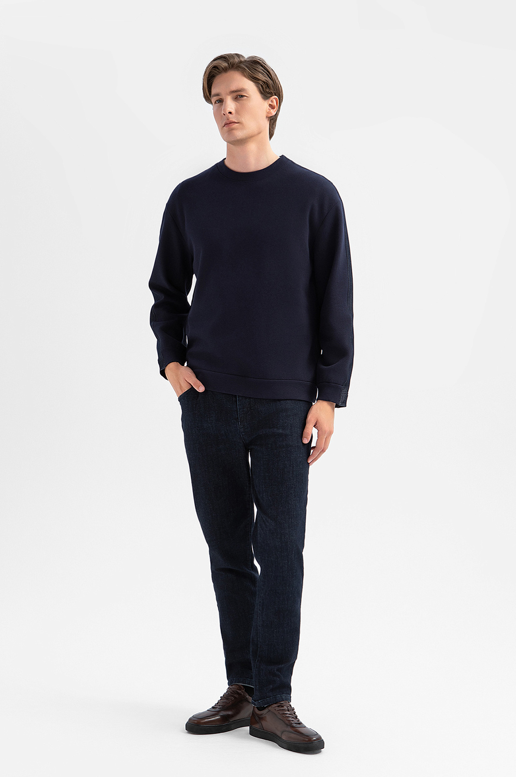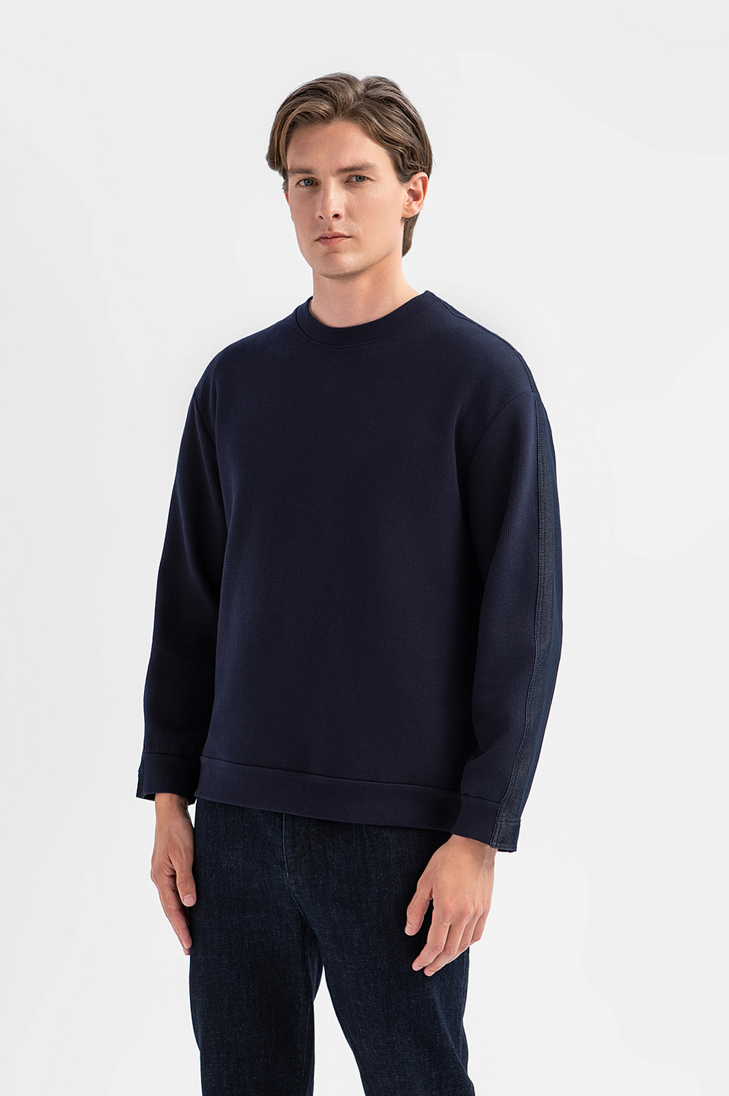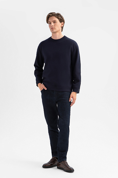 Толстовка KANZLER глубокого синего цвета из лимитированной коллекции — это интерпретация привычной спортивной классики и современного городского стиля, которая создана для тех, кто ценит оригинальный лаконичный дизайн без лишней вычурности. Спереди модель выглядит как традиционная универсальная толстовка: аккуратный круглый вырез горловины и лаконичный крой без лишних акцентов. Спинка с кокеткой и притачным поясом с декоративными патами на пуговицах отсылают к силуэту джинсовой куртки. Такое сочетание создаёт выразительный контраст и подчёркивает уникальность вещи. Толстовка сшита из разных по фактуре и составу смесовых тканей. Перед — плотный эластичный трикотаж, спинка — прочный гладкий материал. Параметры модели: рост 191, 97-77-99 Размер на модели: M
