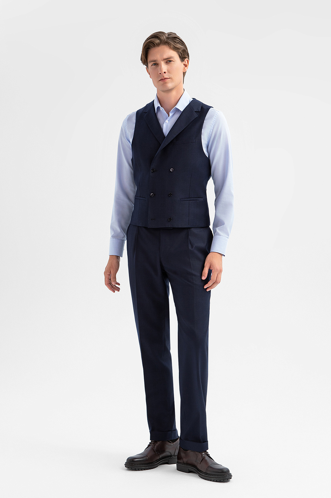 Двубортный тёмно-синий жилет KANZLER из лимитированной коллекции, сшитый из дорогой костюмной шерсти с добавлением нежного кашемира, может быть элементом роскошного костюма-тройки или в неофициальной обстановке заменять пиджак. Это элегантная модель прилегающего силуэта с двумя карманами в рамке и регулируемым ремешком сзади, который позволяет подогнать жилет под фигуру. Дорогая натуральная ткань (90% шерсть и 10% кашемир Супер 130S) с водоотталкивающей обработкой бережёт естественное тепло тела и сохраняет устойчивость к загрязнениям и сминанию. Прочная гладкая подкладка обеспечивает комфорт и лёгкое скольжение при надевании. Параметры модели: рост 191, 97-77-99 Размер на модели: 50